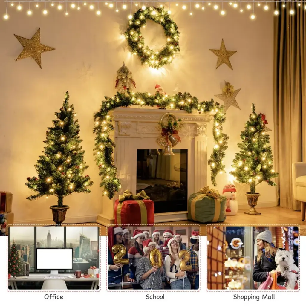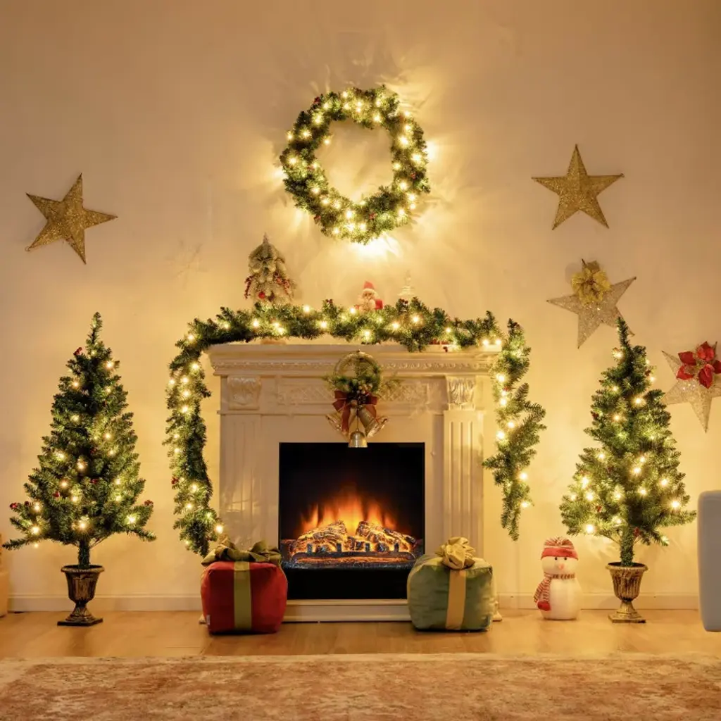 SpecificationsKey Features● 4-Piece Christmas Celebration Set: This attractive Christmas set includes a 24" traditional wreath, a 9ft rattan and 2 entrance trees, which can perfectly match with mantel, windowsill and stair railing. Besides, the festival set with verdant leaves and red berry clusters will well garnish your home and increase the spirit of the festival. ● Enjoy Warm and Romantic Lighting: 200 pre-strung LED lights (50 lights for each one) showcase warm and bright lighting effect, making home full of festival vibe and holiday feel. Turning on the light, you can get a charming Christmas set perfectly decorate your home, which can add joyful touch to corners during the holidays. ● 6-Hour Timing Function with Easy Control: There is a convenient timer switch for you to control the lighting, and all lights are operated by 3 AA batteries (the batteries are not included). Also, the switch control has 6-hour timer, which can make lights turn off automatically. ● Premium PVC Material for Lasting Use: Made of premium PVC material, this Christmas celebration set ensures odorless and non-toxic feature, allowing you to decorate home safely and durably. In order to reuse for years, fine craftsmanship and strong adhesion make these realistic decorations hard to wither or fade. ● Make Every Corner Full of Festival Vibe: The combine of artificial trees, wreath and garland is an ideal decoration for home, office and school, creating strong festival atmosphere and holiday cheer. Hope you have an unforgettable memory during Christmas season.