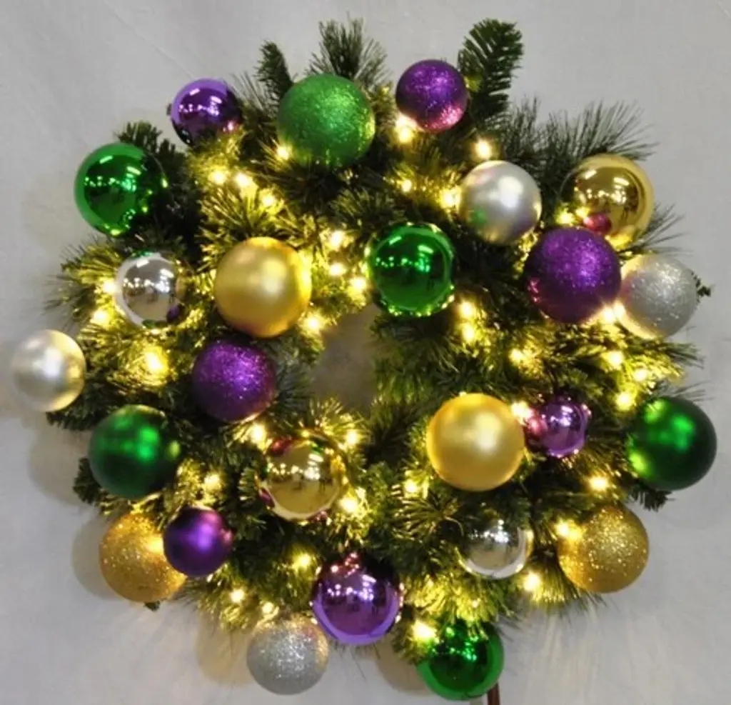 4'' Pre-Lit Warm White Led Sequoia Wreath Decorated With The Mardi Gras Ornament CollectionThe fashionable 48"wreath is artfully crafted with Sequoia tips.(580 Tips) Creating the utmost realism and eye catching appeal, neighbors and customers will love this wreath for years to come. Lit with 140 LED warm white lights and decorated with our classy Mardi Gras collection. This wreath is sure to add class to any room.