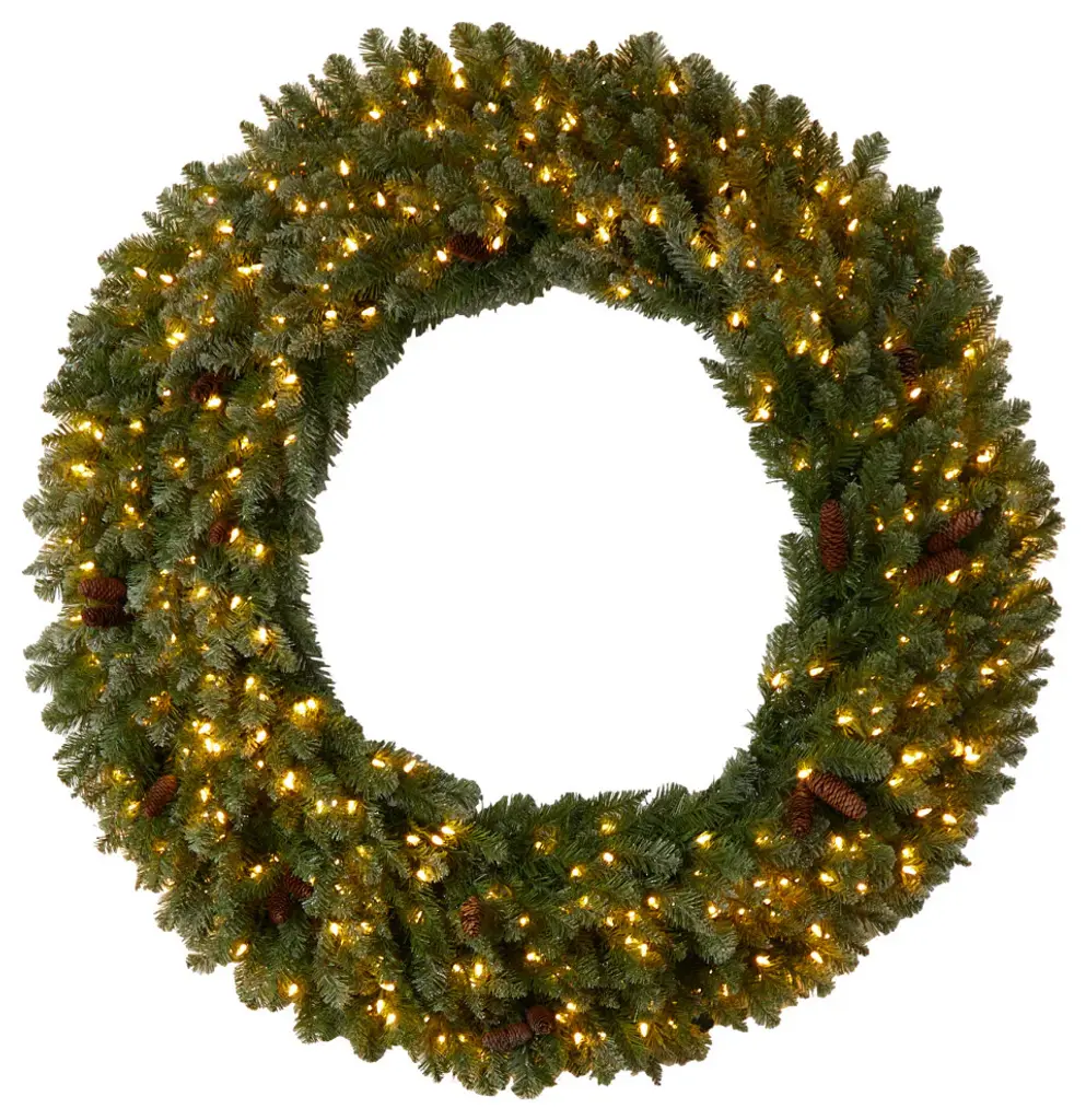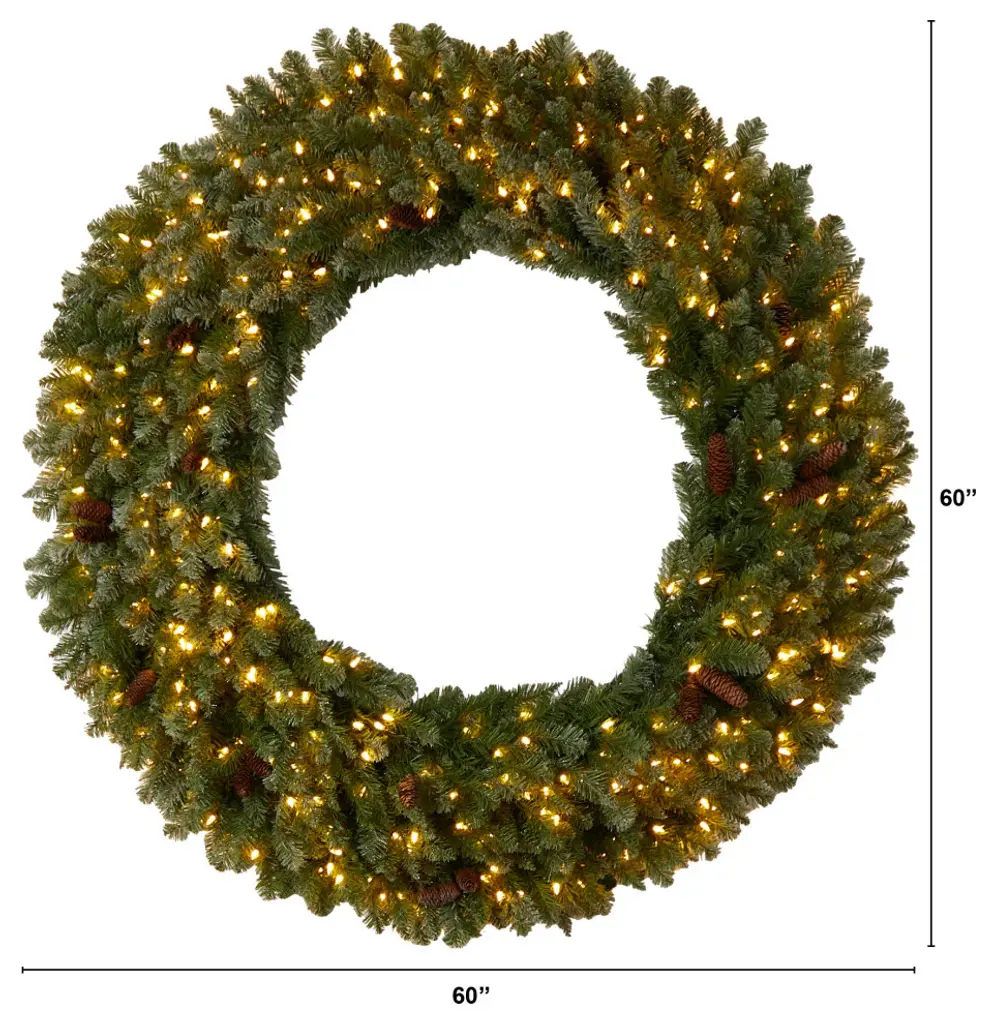 Add the WOW factor to your holiday decor with this flocked artificial Christmas wreath intricately designed from realistic looking pine foliage in a palette of seasonal evergreens flocked in a coat of faux-snow, carefully accented throughout with faux pinecones that look incredibly realistic. Arriving pre-strung with 300 clear LED lights to effortlessly illuminate either a large wall or door, this 5ft. (in diameter) decorative wreath makes for an inviting accent and will undoubtedly transform any entrance all throughout the holiday season. Perfect for a large space in need of some holiday cheer. Artificial wreaths are manufactured using synthetic materials, such as polyester material or plastic, and are well designed and constructed to be life-like in appearance. This item will need to be re-shaped when removed from the secure box to allow it to reach its fullest size. Your wreath will look beautiful for years to come; simply wipe clean with a soft dry cloth when needed.