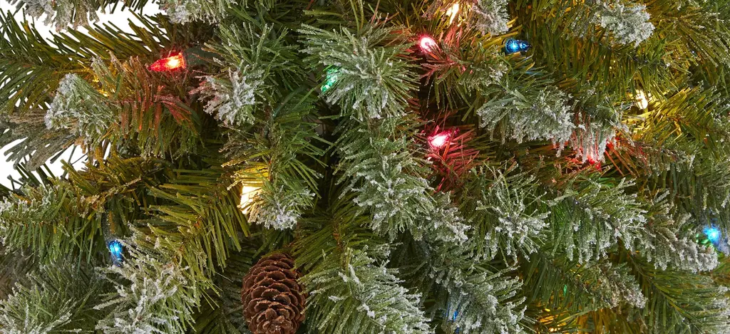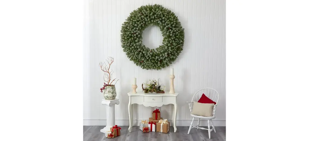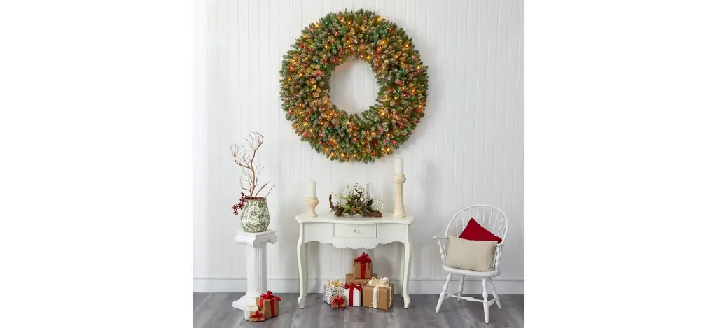 Light up your favorite seasonal accents while adding serious curb-side appeal with this artificial Christmas wreath intricately designed from realistic looking foliage in a palette of seasonal evergreens and accented throughout with faux pinecones that look incredibly realistic - all finished with a light dusting of fake snow . Arriving pre-strung with 280 multi-colored lights to effortlessly illuminate either a wall or door, this 5' (in circumference) decorative wreath makes for an inviting accent and will undoubtedly transform any entrance all throughout the holiday season.