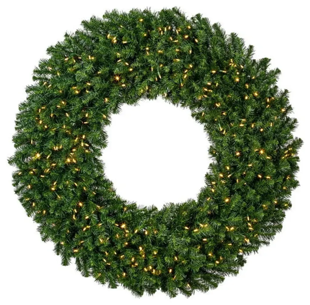 The deluxe Windsor pine features thick two-tone dark green tips which creates a full luxurious look Product Features:Pre-lit with 400 clear mini lights1040 tips1.5" wide tapered tips28" green lead cord Additional Product Features:Light sets on the wreath are UL listed for indoor or outdoor use however the wreath itself is recommended for indoor useIf one bulb burns out the rest will stay litLights are equipped with Lamp Lock feature which makes them replaceable interchangeable and keeps them from falling outContains 1 plug with end connector which allows you to stack multiple lighted items together (not to exceed 210 watts)Some assembly required - 4 sections easily bolt together hardware is includedIncludes a heavy duty triple ring metal frame backing for hangingComes with replacement bulbs and spare fusesWire gauge: 22 Dimensions: 72" diameter (measured from outermost tip to outermost tip across the wreath)Material(s): PVC/metal/glass bulbs/wire