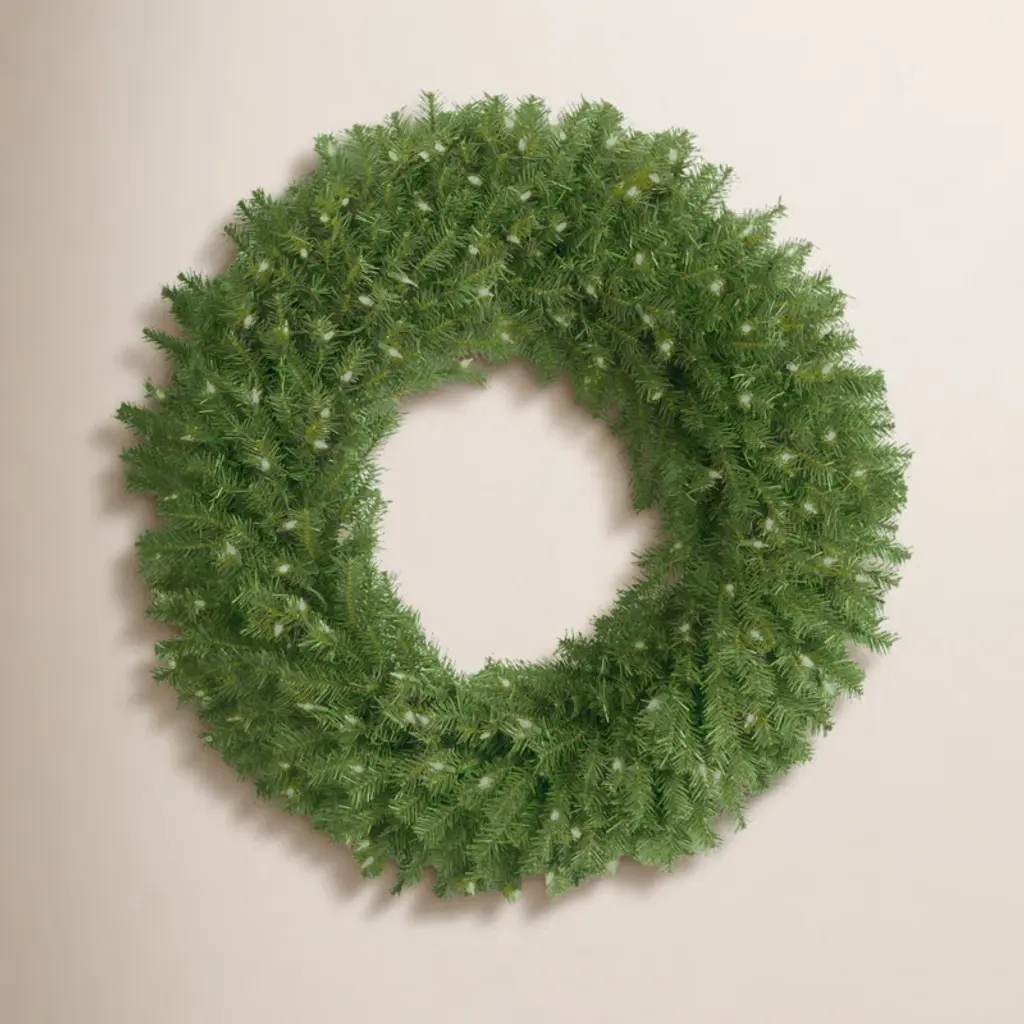 This large and lush wreath is perfect for decorating commercial spacesProduct Features:Pre-lit with 500 clear mini lights2" wide tips23" green lead cordAdditional Product Features:Light sets on the wreath are UL listed for indoor or outdoor use however the wreath itself is recommended for indoor useLights are equipped with Lamp Lock feature which makes them replaceable interchangeable and keeps them from falling outNo assembly required " wreath comes in 1 pieceWreath folds in half for storageIncludes a heavy duty ring metal frame backing for hangingComes with replacement bulbs and spare fusesWire gauge: 22120 volts 60 hertz 0.17 amps 20.4 wattsDimensions: 60" diameter (measured from outermost tip/edge to outermost tip/edge across the wreath)Material(s): PVC/metal/glass bulbs/wire