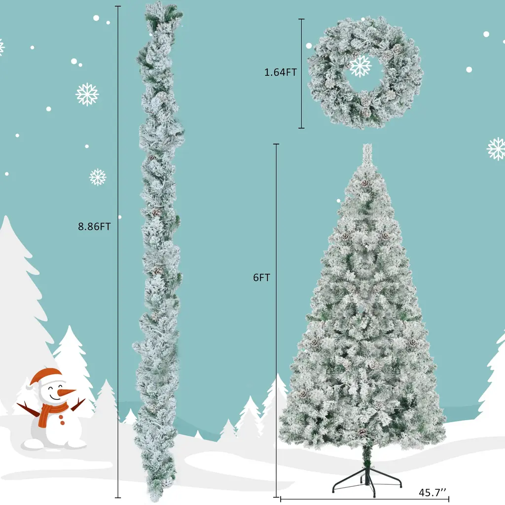 FeaturesMaterialIron frame + PVCTip ColorGreen + WhiteLight ColorWarm Lights & colored LightsTip Count6ft Tree: 928, 9ft Garland: 200, 20in Wreath: 150Light Count6ft Tree: 250, 9ft Garland:60, 20in Wreath:50Pine Cones Count6ft Tree: 28, 9ft Garland:12 20in Wreath:8DimensionTree: 6ft, Garland: 9ft, Wreath: 1.64 ftTree Diameter45.7inchNet Weight26.43lbsLuxurious & Vivid Appearance: Christmas tree has 928 branch tips and 28 pine cones. Wreath has 150 branch tips and 8 pine cones. Garland has 200 branch tips and 12 pine cones. This 3 - piece collection not only brings the perfect amount of holiday cheer to your home during the holiday season but also, with its romantic snow - flocked design, transforms your home into a winter wonderland.Pre-Lit Design: Christmas tree has 250 LED lights,whether wreath has 50 LED lights, garland has 60 LED lights. LED Lights include multi-color and warm yellow LED lights and there exist 8 dynamic lighting modes for you to choose from, providing a fantastic lighting show for your Christmas holiday.Premium PVC Material for Lasting Use: Crafted from premium PVC material, this set is safe for home decoration. Fine craftsmanship and strong bonding make the decorations durable and less prone to fading or discoloration.Easy Assembly and Disassembly: The pre-lit Christmas tree has hinged structures for automatic branch spreading, saving installation time and effort.Suitable for Various Occasions: This versatile set, including the artificial tree, garland, and wreath, is ideal for decorating homes, offices, and schools. It creates a festive atmosphere and spreads holiday cheer wherever it's displayed.