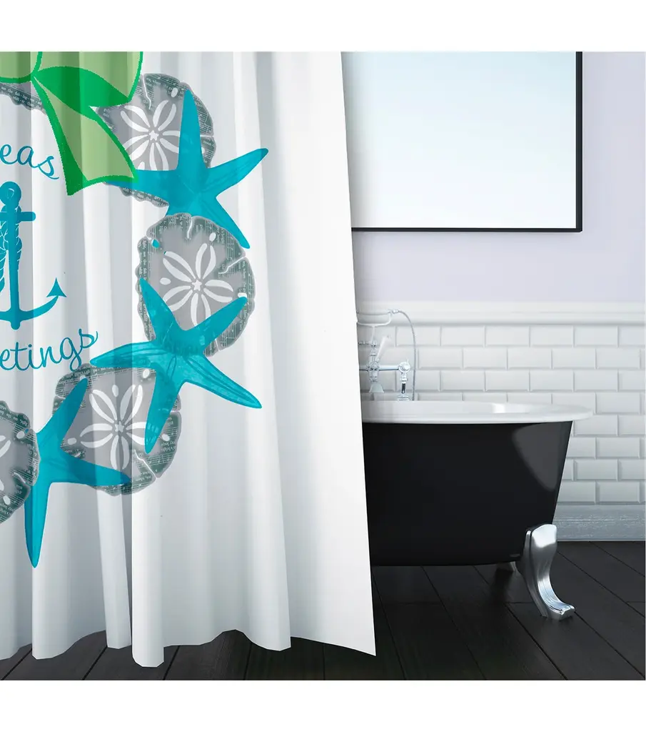 Celebrating Christmas at the beach? Then enjoy a Simply Daisy 70" x 73" Turquoise Seas and Greetings Wreath Shower Curtain from our Coastal Christmas Collection!This durable and decorative polyester fabric shower curtain has a single sided design and a buttonhole top to easily refresh your bath for each season. It is made of 100% polyester that is quick drying. When it needs to be washed, just toss it into your washing machine, and then tumble dry. Everyone will enjoy the color and cheer brought to your bath space by this decorative shower curtain! This Collection includes prints and patterns with the power to fill your home with holiday spirit!