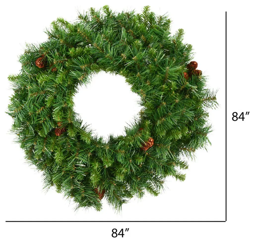 84" Cheyenne Pine Wreath 40Cones 1300TVickerman 84" Cheyenne Pine Artificial Christmas Wreath, UnlitLight Color: UnlitTips: 1300Color: GreenProduct Dimensions (W x D x h): 84 x 5 x 84