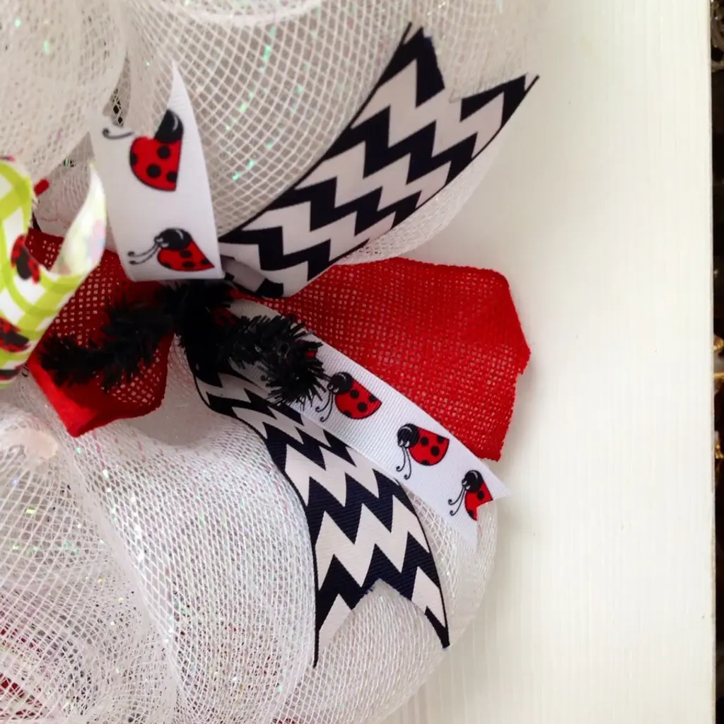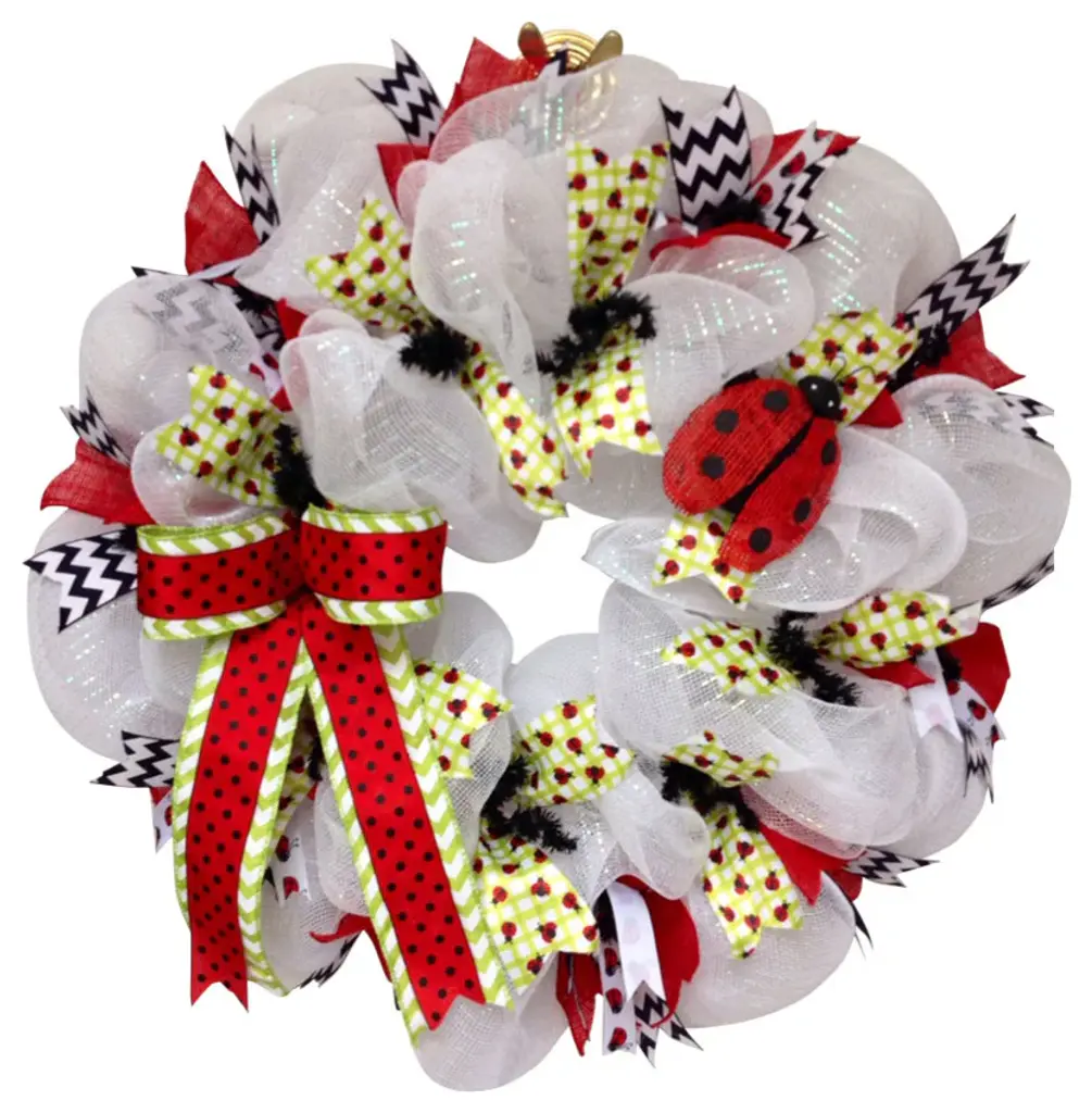 Adorable, Large, Full, Premium Deco Mesh Lady Bug Wreath. Perfect for Spring or Summer. Large, adorable lady bug rests on a bed of iridescent white deco mesh. The inner ring has green gingham ribbon with tiny red lady bugs. The outer ring has black and white chevron ribbons, red burlap ribbons and tiny white lady bug satin ribbons. A large green and white chevron bow with red and black polka dot ribbon rests to the side. Size is 24 inches in diameter and 6 inches deep.