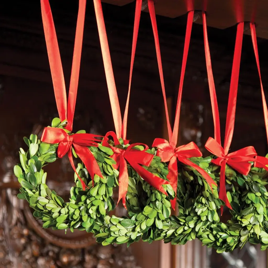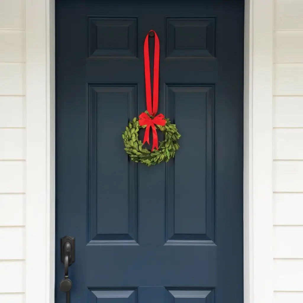 Bring effortless cheer to your holiday decor with this artificial wreath. Handcrafted for use year after year, this holiday wreath features layered boxwood leaves with a lush green hue that suits your Christmas color scheme. At the top center, a red ribbon bow and bell decorations make it even more festive. Plus, it features a ribbon hanger that makes it easy to install over any door or window. This Christmas wreath looks great displayed anywhere, and best of all, you can make it your own with some baubles and lights of your choice (sold separately).