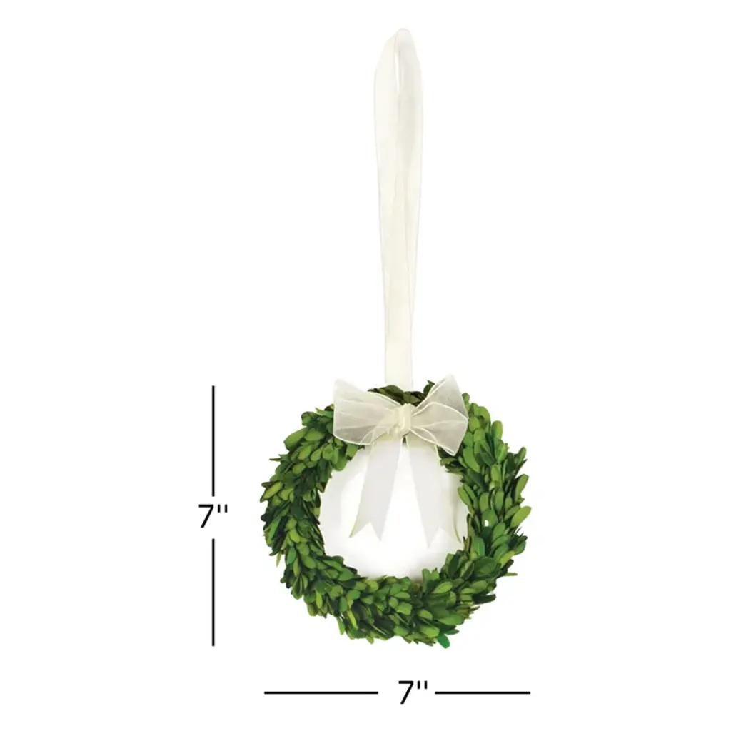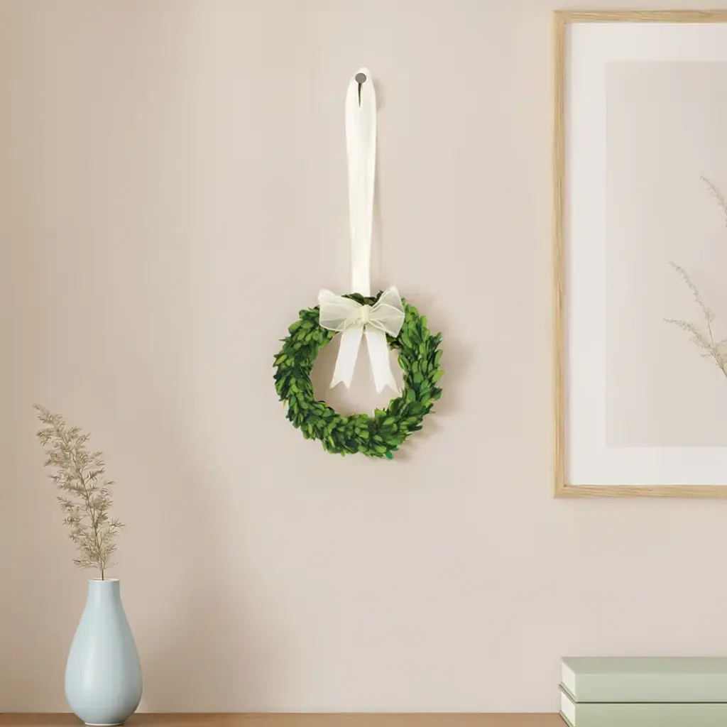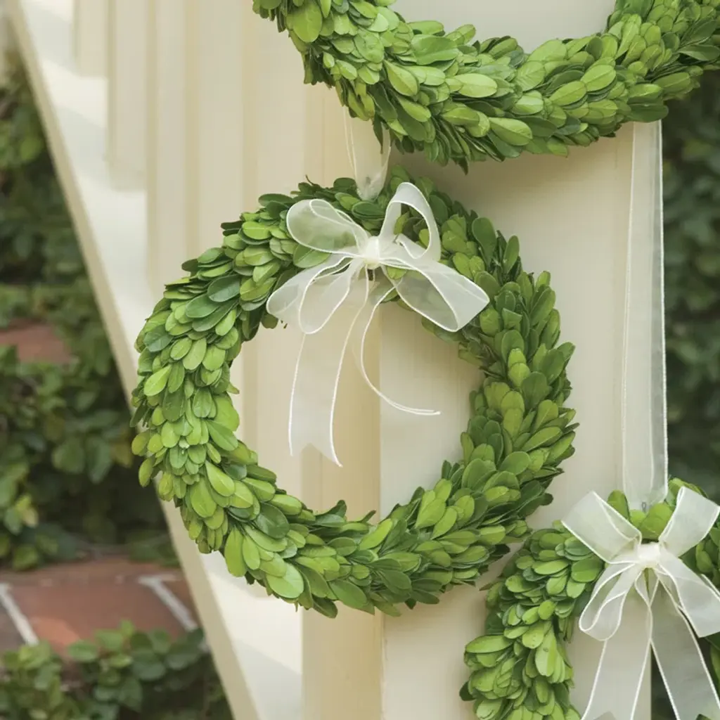 Thick and lush, this artificial wreath brings a vibrant touch to any spring or summer decor. It's made from real, preserved boxwood leaves, layered in an even, smooth arrangement with vivid green hues. Its classic circular shape and wide thickness for an impactful look on any door or window. A cream ribbon adds a subtle glam look, tied in a bow at the top of the wreath. We especially love that its simplistic look is easy to customize with faux blossoms or baubles of your choice, so it's easy to change its look from season to season.