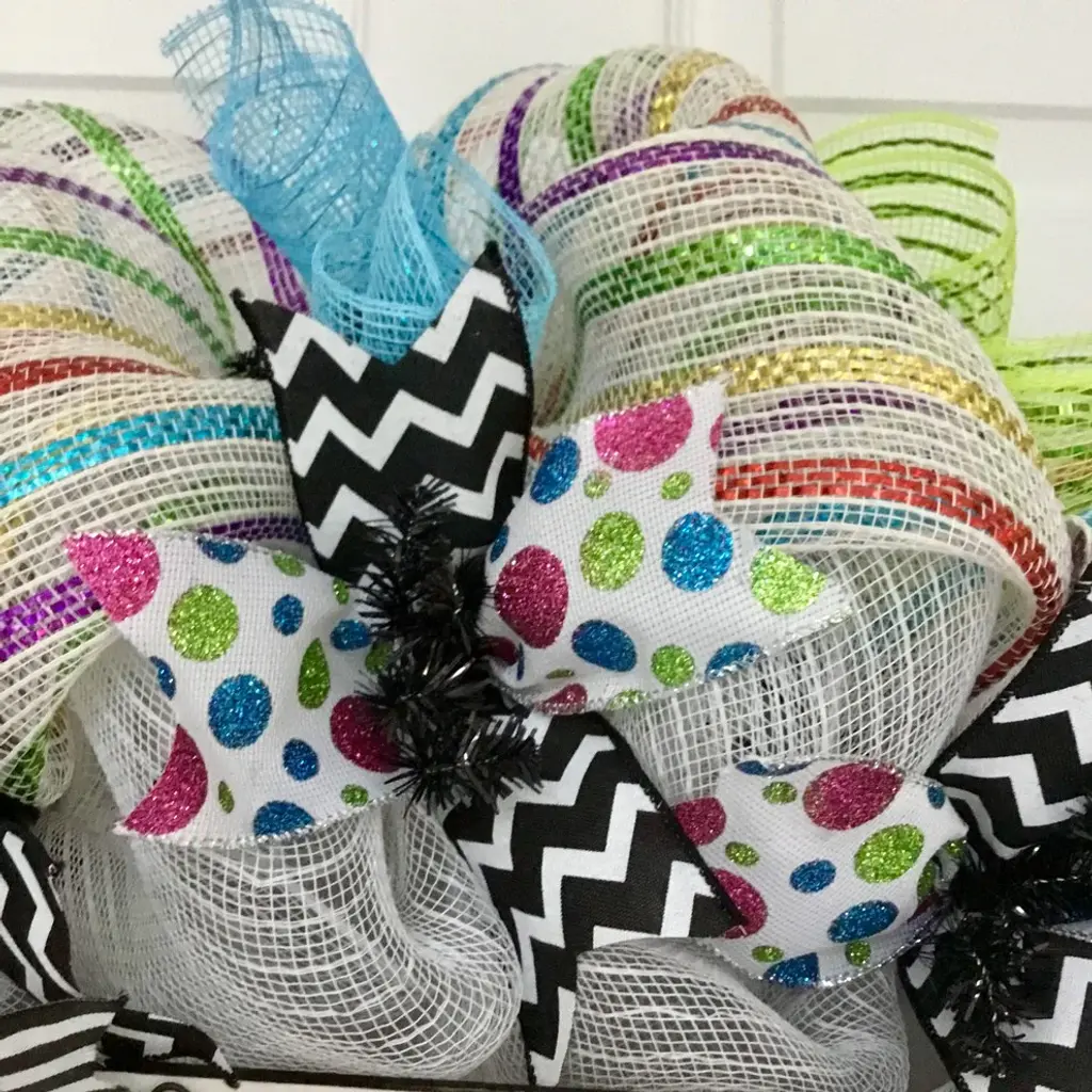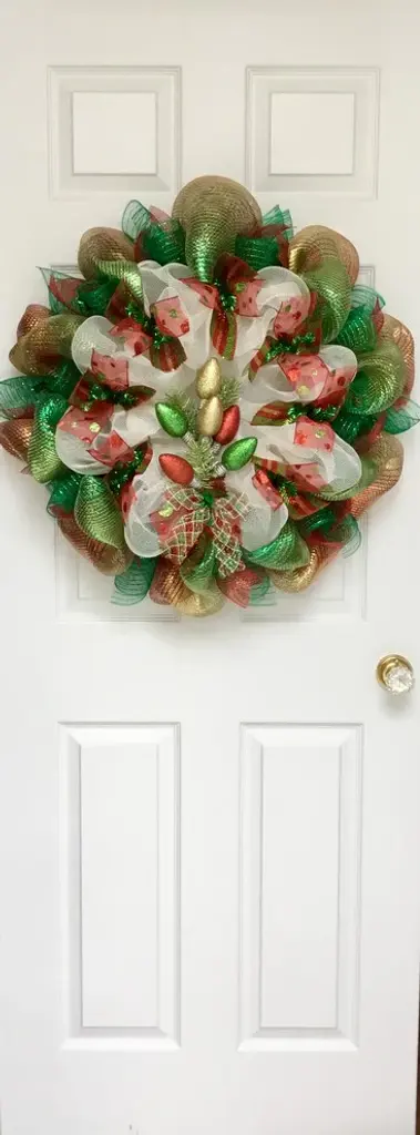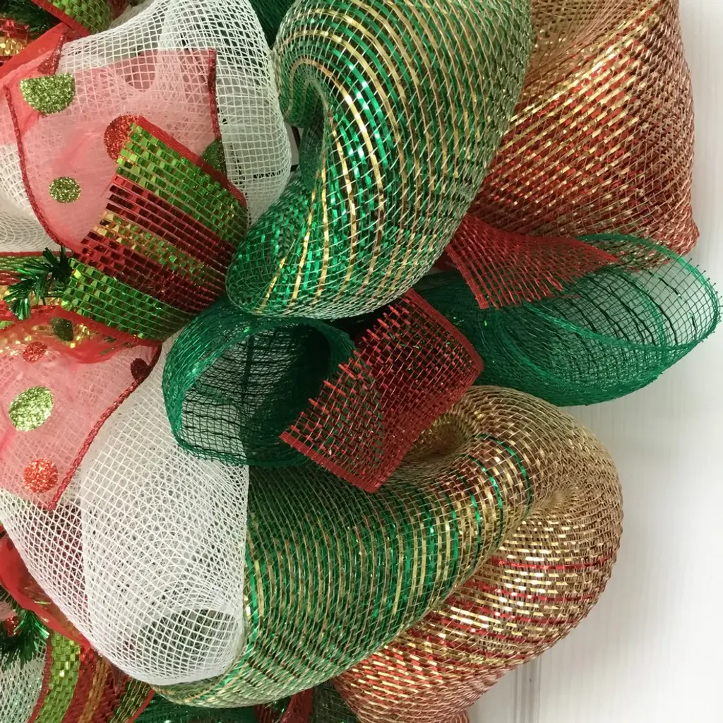 New! Large, Premium, Full Handmade Deco Mesh Holiday Wreath. Large, shimmering red, gold and green bouquet of Christmas Lights and greenery rests on a bed of creamy ivory deco mesh. An adorable red, green and white flex ribbon is added to the bottom of he bouquet. The inner ring has bright red sheer ribbons sparkling polka dots. Beautiful red, green and gold striped metallic mesh ribbon are also added. The outer ring is made with glittering red, gold and green thread deco mesh. This Mesh is gorgeous! Green flutes and red mesh ribbons surround the exterior. It is perfect for the holiday season. Size is large, 24 inch diameter and 6 inch depth. Please see photo for size comparison.