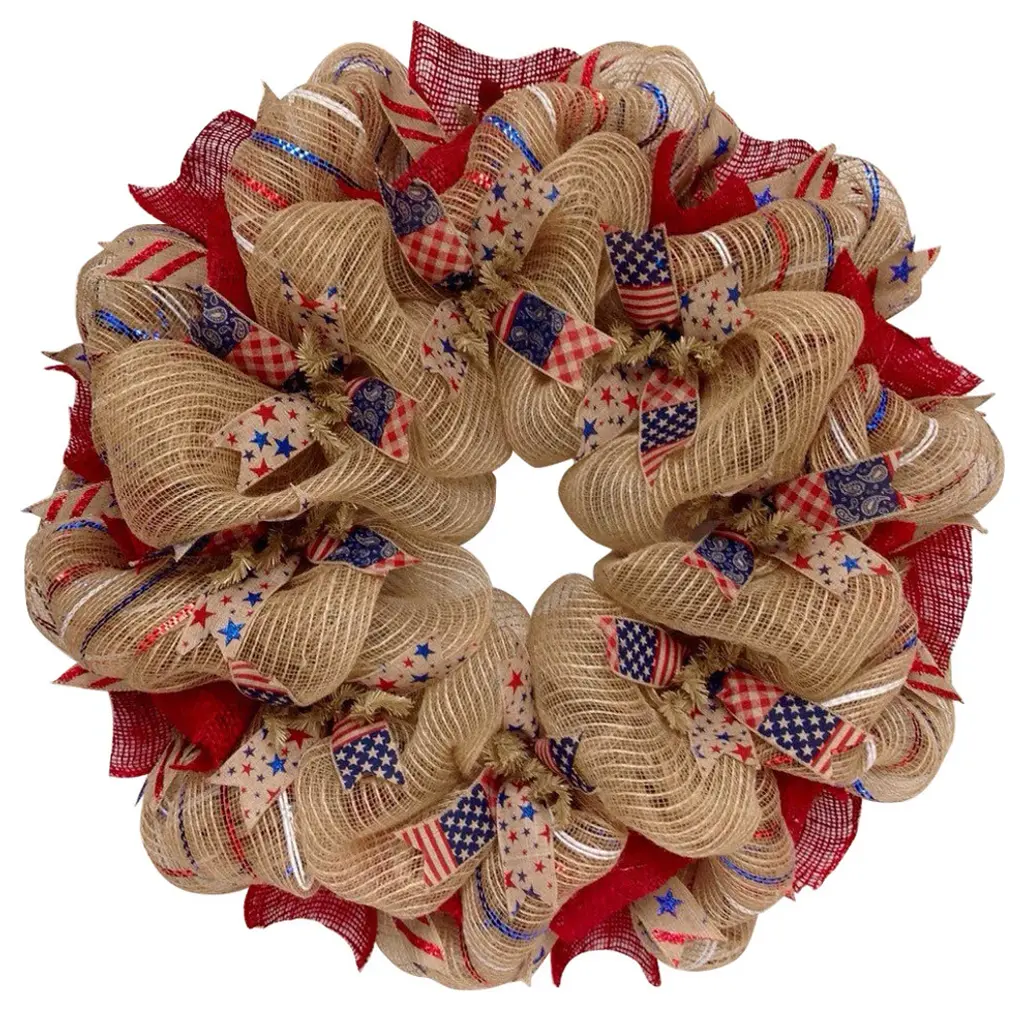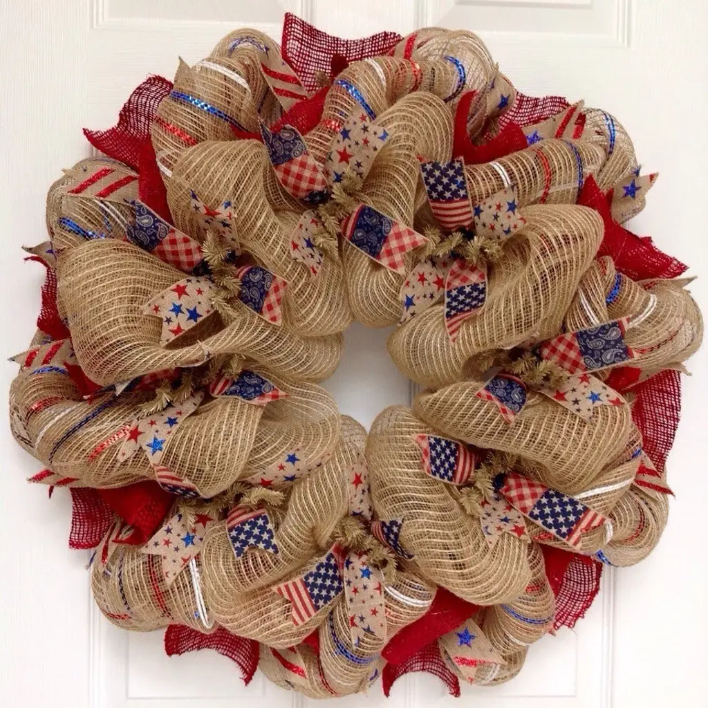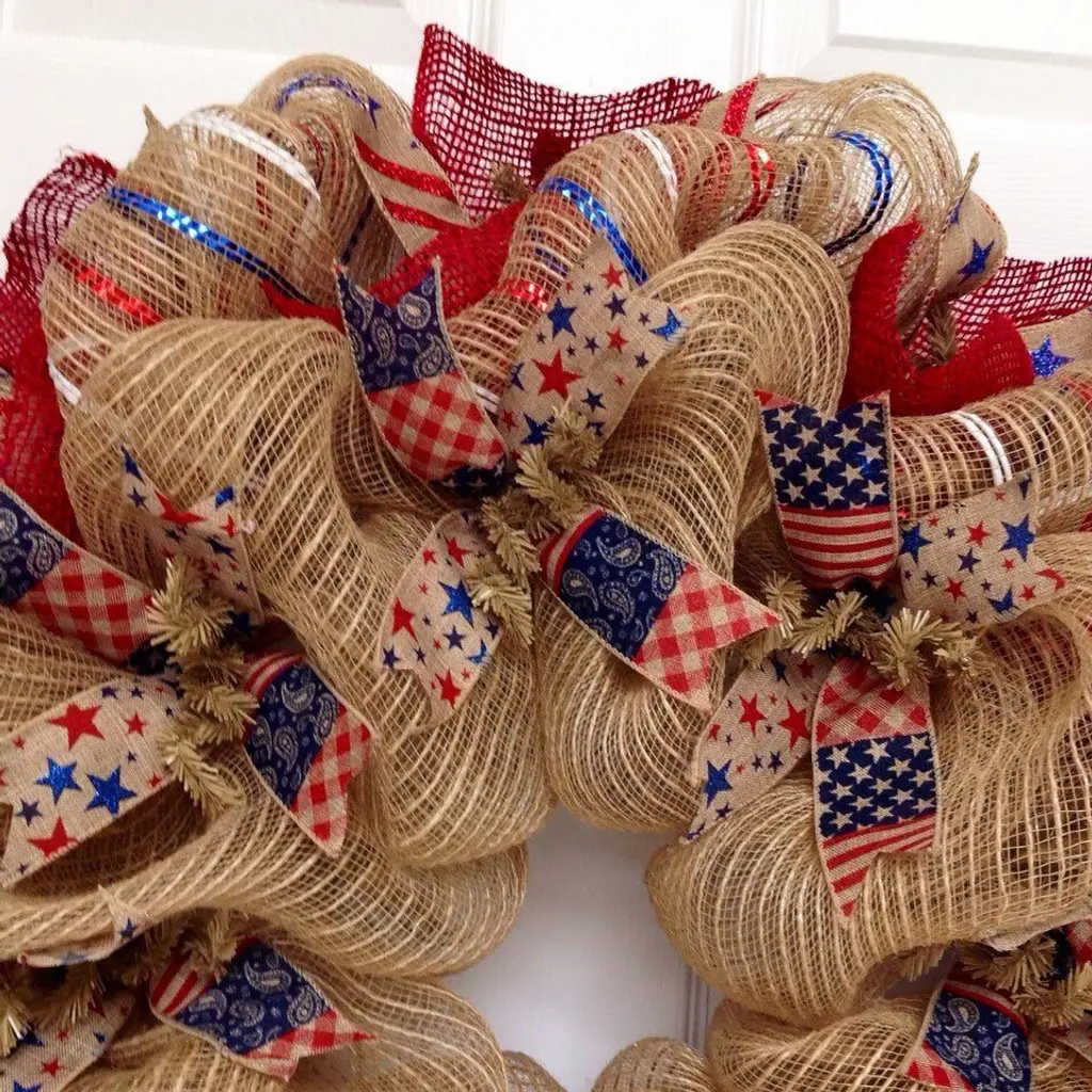 Beautiful! New! Pemium! Full! Handmade Patriotic Wreath. Beautiful historic faded colors of red, white and blue ribbons and matching red and blue star ribbons rest on the creamy, natural burlap center ring. The outer ring has beautiful red, white and blue metallic striped burlap deco mesh with bright red burlap fabric. Beautiful canvas ribbons with glittering Stars and Stripes surround the outside of the wreath. Perfect for all patriotic holidays and year round home decor. Measurements are a large 28 inch diameter and 6 inches deep.