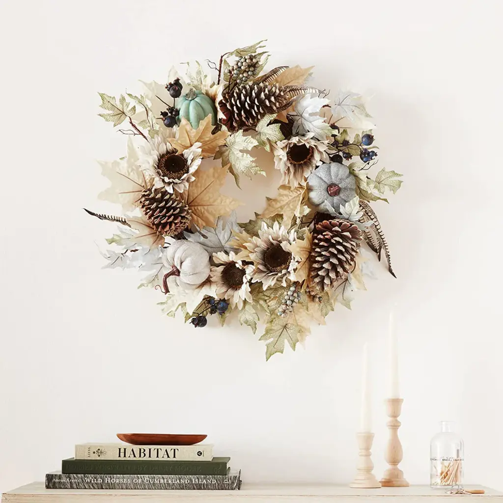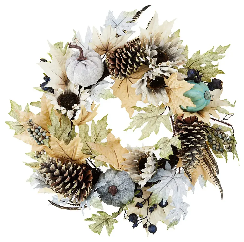 Beautiful Rustic looking sunflower wreath with velvet pumpkins and Pinecones. This Fall decor velvet wreath is and uplifting and is perfect for any fall season. The wreath comes with pumpkin, sunflowers maple rustic leaves, berries, feathers and pinecones. A perfect accent piece for front doors, windows, walls for office or Home. Size 28"L x 28"H x 5.5"D . Item comes compressed, primping and fluffing required to match on the image shown. No assembly required. Recommended for indoor use.