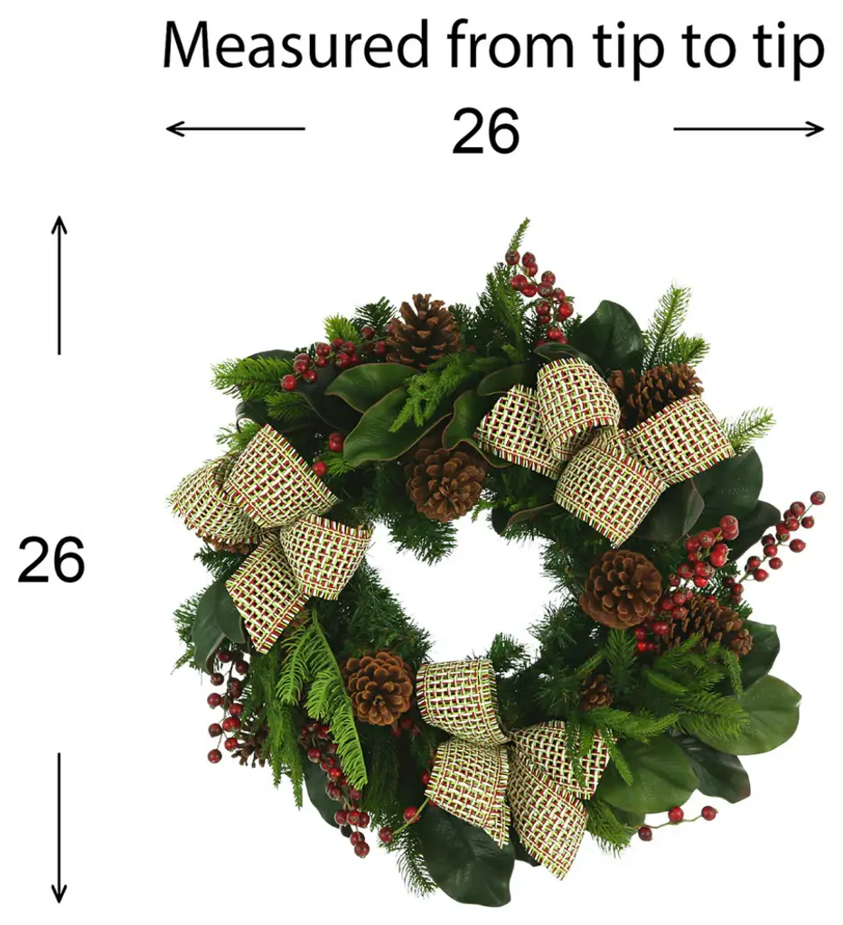 Decorate for the winter holidays with this grand and elegant Mixed Pomegranate Pine Cone Magnolia Leaf & Pine Wreath. Adorned with mixed pine cones, faux pomegranates and magnolia leaves that add a festive Christmas flair to any setting. Easily incorporate into displays as home decor, office accents, event centerpieces, and productions for a beautiful, seasonal feel. Add a cheerful touch to tabletops, mantles, doors and walkways, stairs and railings, mailboxes, pillars and more!Features: • 22" L x 22" W x 4" DP • Sturdy twig branch ring backing • Pre-adorned with pine cones, faux pomegranates and magnolia leaves • Simply string with lights or extra ornaments for a seasonal look • Best for indoor or covered outdoor usage • Product may ship compressed. Primping of branches and greenery may be required to match the image shown. Forever fresh, no hassle. Images represent actual product, but please understand color may vary slightly due to differences in computer monitor color displays, photographic lighting, or image enhancement.