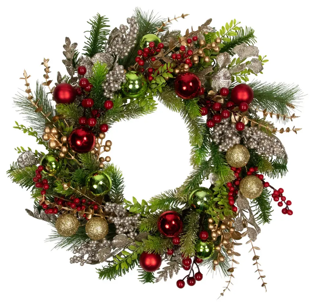 Add the perfect amount of greenery to your winter decor with this artificial wreath. Accented with bright red berries and poinsettia flowers with glitter centers, you can make a small area sparkle and pop with color. Perfect to display over doors and mantles. Product Features: Green foliage, red berry and red poinsttia artificial Christmas wreath Green foliage includes long pine needles, cedar, traditional pine, and eucalyptus branches Accented with and shiny red ornament balls and large pine cones Natural, grapevine circular twig backing for hanging No assembly required - wreath comes in 1 piece Recommended for indoor use Dimensions: 5" high x 28" diameter Inner: 11.5" diameter (approximately) Material(s): PE/metal/plastic/foam/polyester/wood Note: Branches are compressed for shipment, and need to be fluffed out upon arrival to look like the photo.
