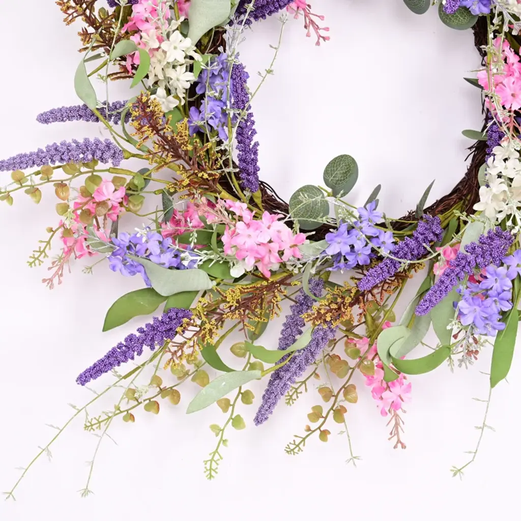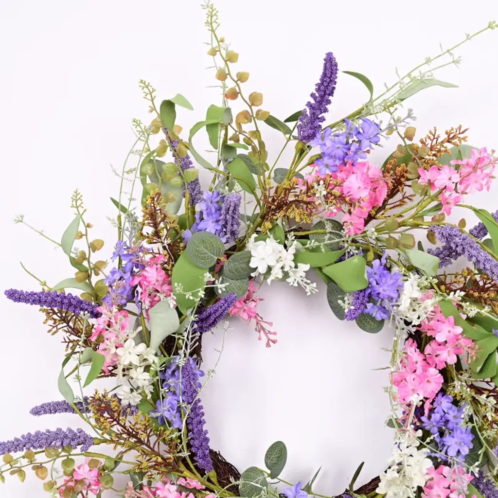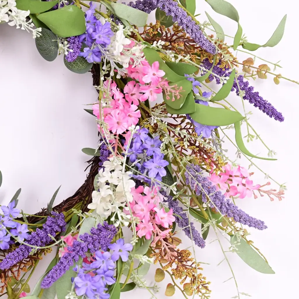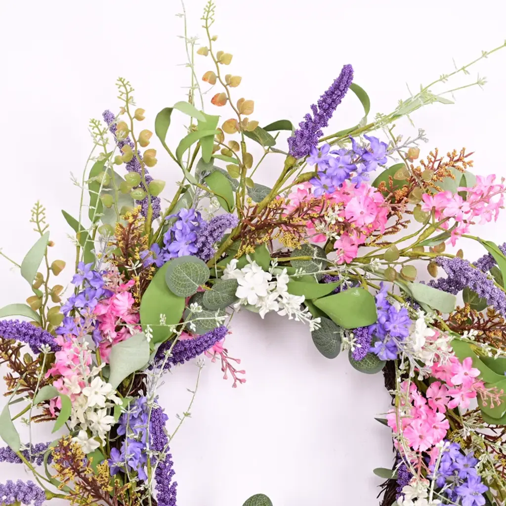Bring the refreshing essence of spring and summer into your home with this Artificial Spring Summer Daisy Mini Eucalyptus Foliage Leaves Wreath. Featuring vibrant green corn leaves, soft purple berries, and delicate pink-white flowers, this wreath adds a cheerful, festive touch to any space. Perfect for daily use, weddings, and parties, it brightens your front door or event decor with its lively and elegant design. Easy to maintain, this wreath offers long-lasting beauty, making it a perfect seasonal accent for your home.