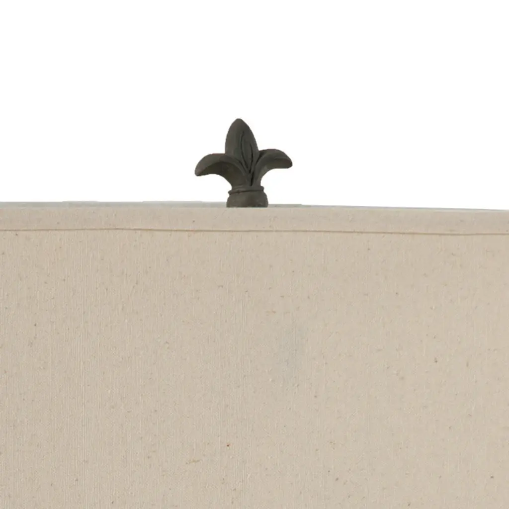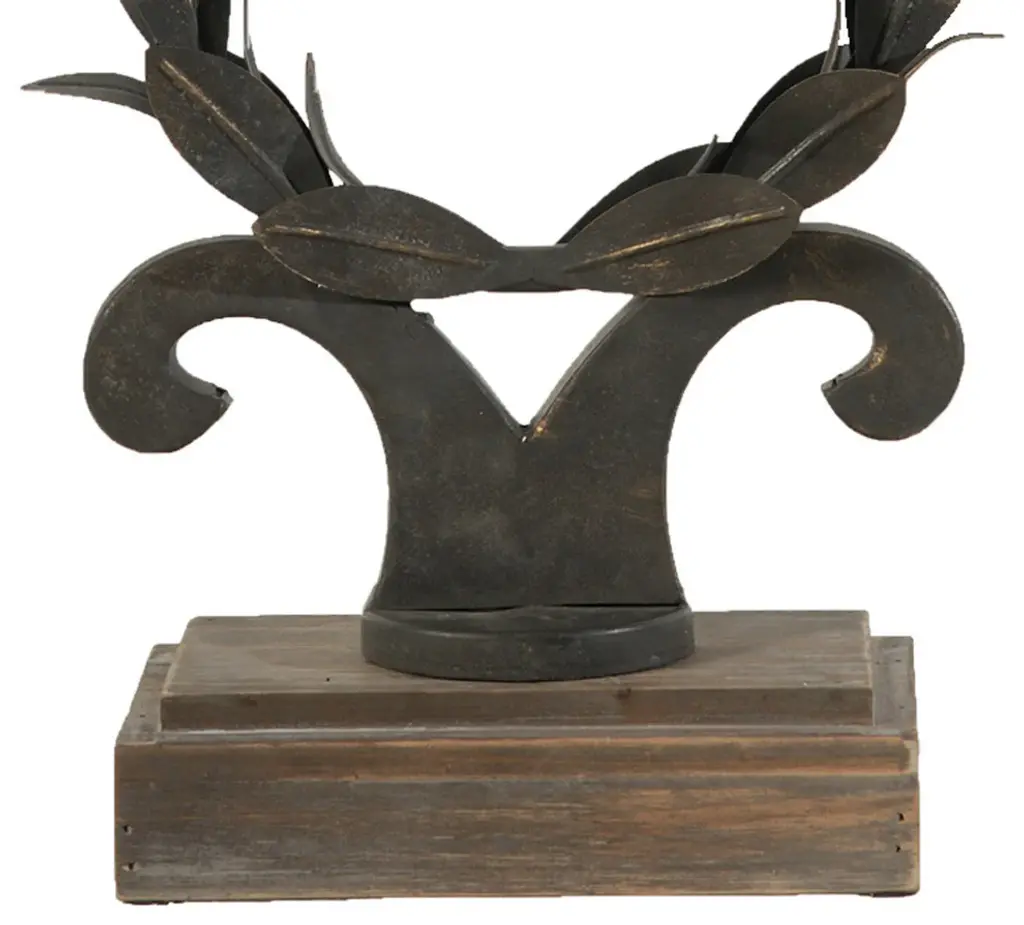 This expertly designed laurel wreath accented table lamp is the epitome of fine craftsmanship and elegance. It features a classic trapezoidal shade, wrapped in clean off white linen like fabric that coordinates with the contrasting antique black accented iron frame. The pine wood platform block depicts subtle wood grain details and molded trim for a nature inspired appeal