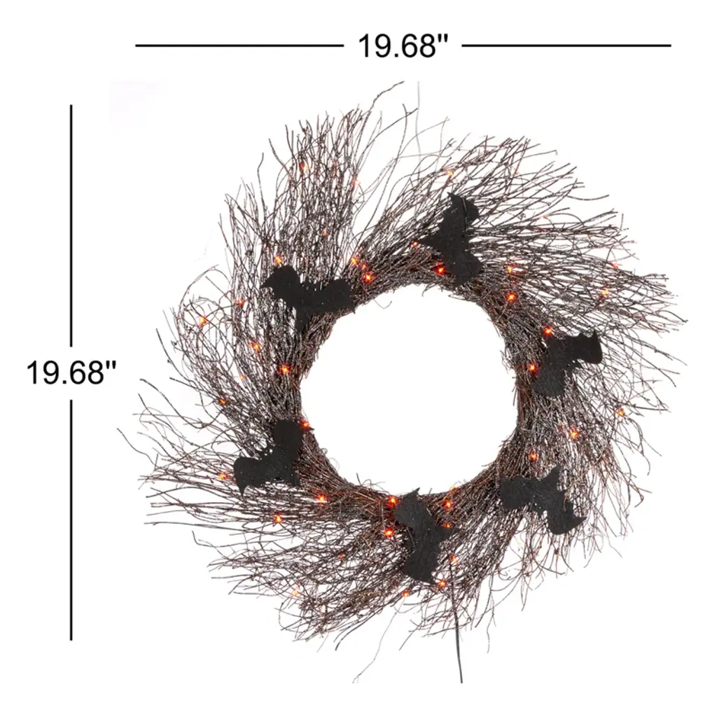 Its that time of the year again! Bring a fright, to your neighborhood with this spooky, creepy crawly Black Twig Halloween Wreath. Artistically design and made of quality materials, this Halloween wreath features black bats and 60 orange LED lights. At 19.68 inches in diameter and intertwined with twig and topped with glitter, this wreath will fill out any front door! Celebrate the scariest of all holidays with this wreath that you can use for years to come.