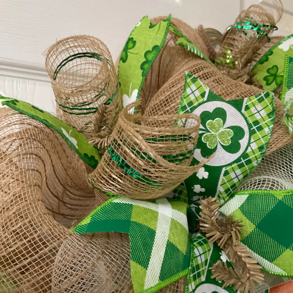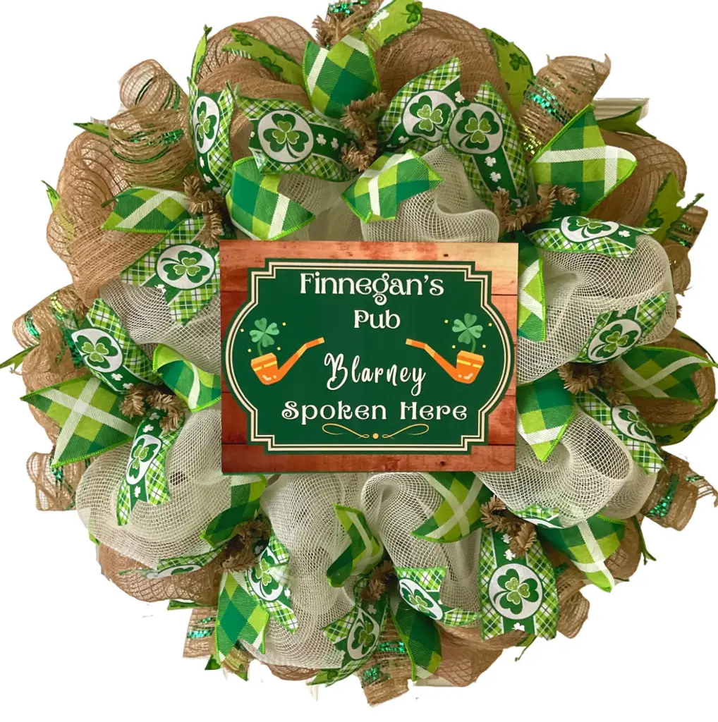 Handmade Deco Mesh St Patricks Day Wreath. A uv protected, aluminum sign rests on a bed of ivory deco mesh. The sign is decorated with two leprechaun pipes and shamrocks. The sign says "Finnegan''s Pub "˜Blarney Spoken Here'' and is written in playful script. Plaid green ribbons and shamrock ribbons surround the accent. The outer ring is made of natural burlap and has green shamrock ribbons and natural burlap flutes with green stripes. The size is 24 inch diameter and a 6th inch depth. Indoor/Outdoor