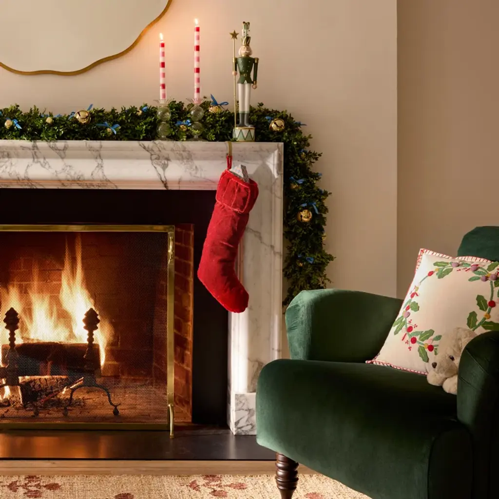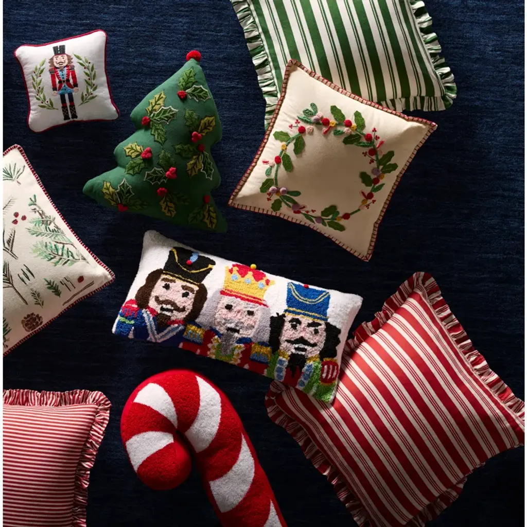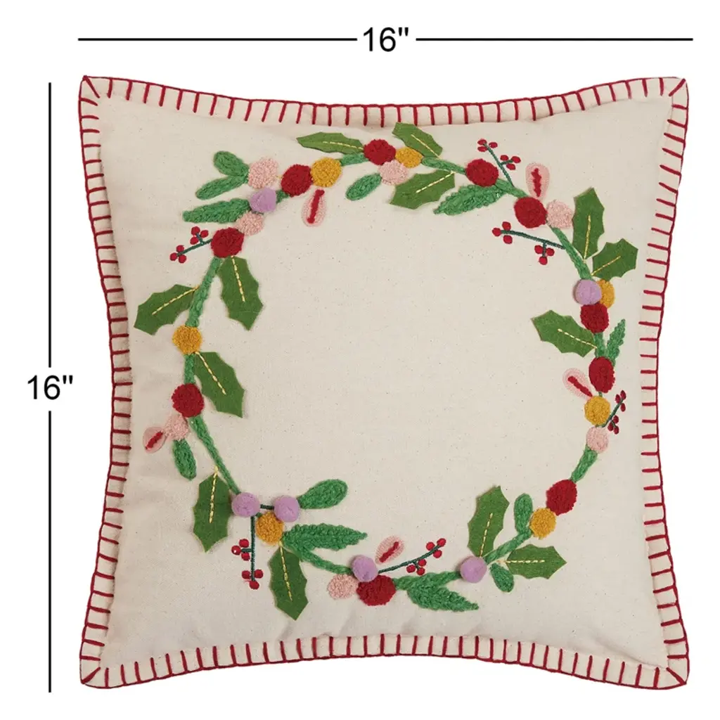 Add a boho touch to your seasonal décor with this colorful, textured wreath pillow! Applique, embroidery, and pom-poms create a fun look on an unbleached cotton canvas ground. Finished with coordinating red whipstitching on all sides.