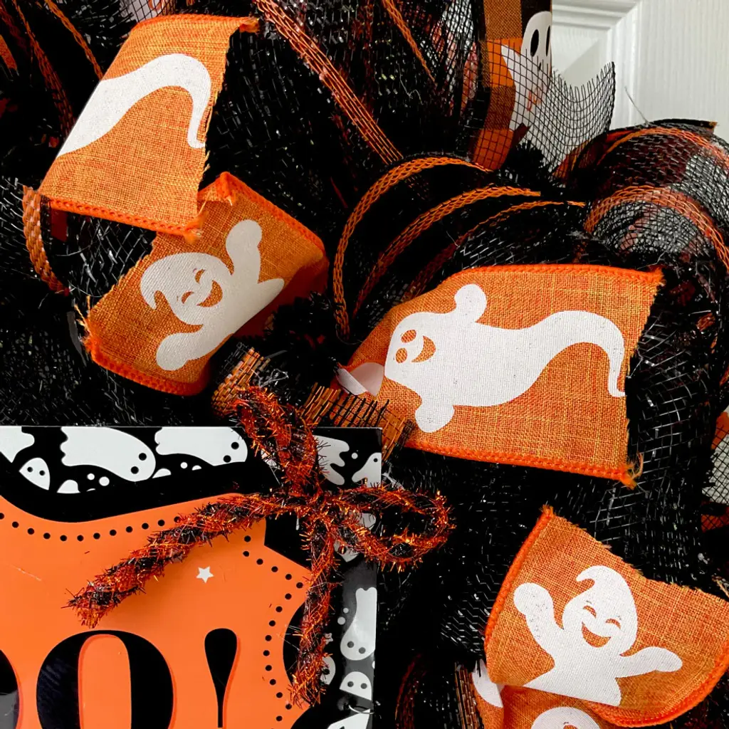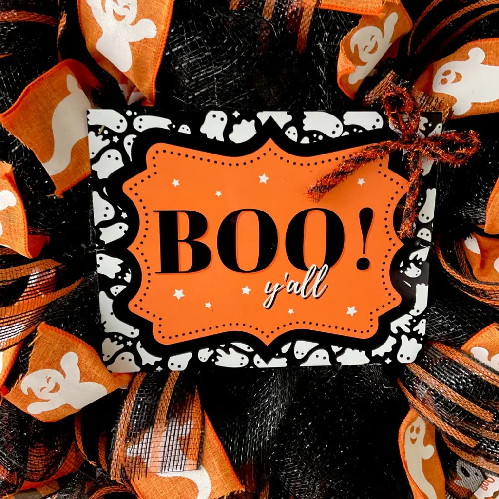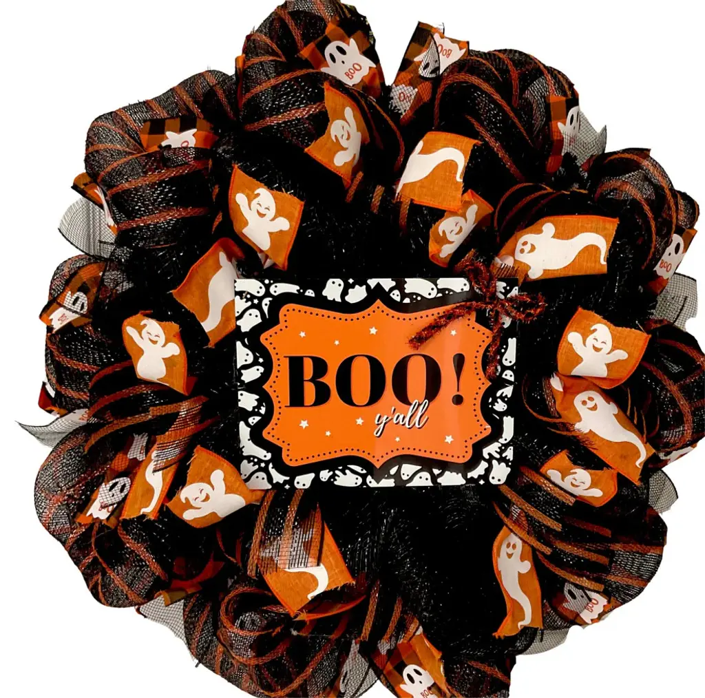 Premium Handmade Deco Mesh Halloween Wreath. The inner ring is made of shimmering, black deco mesh with White and orange ghost ribbon and black/orange striped mesh ribbons. The outer ring is black with orange stripes deco mesh with premium orange and black plaid ghost ribbons and metallic black mesh ribbons. The center wreath is highlighted with a uv protected, aluminum sign which says "BOO y''all." The sign is orange with black lettering and adorable ghosts are painted along the border. There is an adorable Halloween bow placed on the sign. The wreath size is large 24 inch diameter and 6 inches deep.