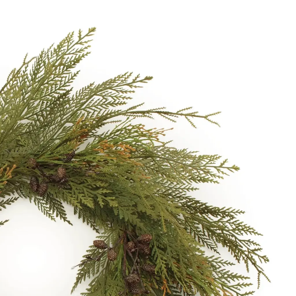 Bring the essence of the outdoors into your home this holiday season with the Cedar and Mini Pinecone Wreath. Featuring wintry green and brown tones, this wreath is adorned with rustic cedar foliage and natural pinecone accents, evoking the charm of a woodland winter. The natural grapevine twig base and wired branches provide versatility for easy shaping and dimensional displays. Hang it on your front door to greet guests, or display it near your Christmas tree or fireplace mantle to add a touch of nature's beauty to your seasonal décor.