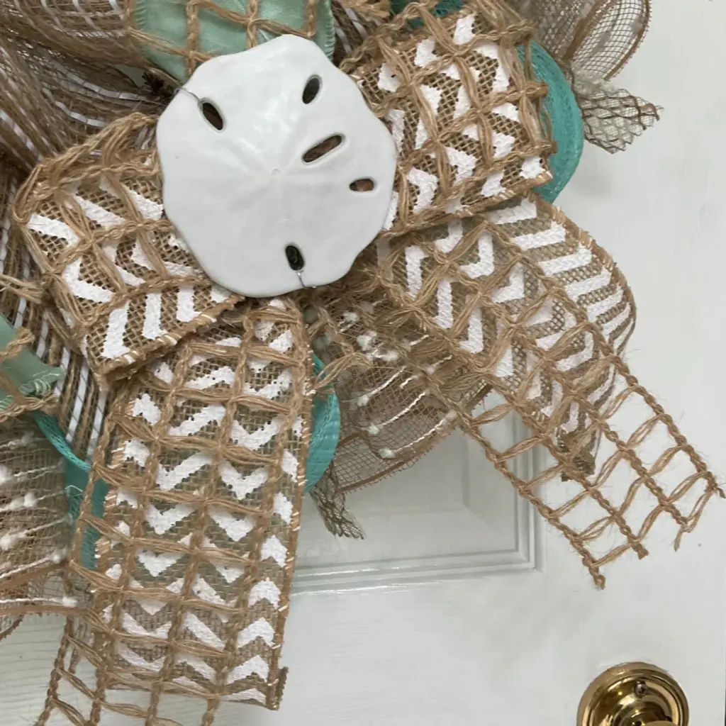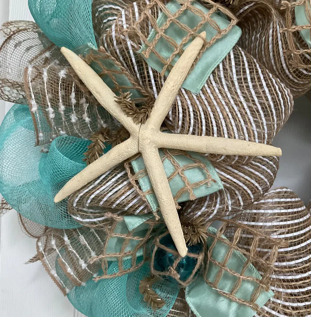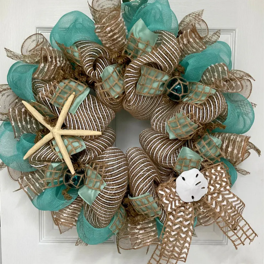 Gorgeous, full , large, handmade deco mesh beach themed wreath. A large white and tan chevron bow with rope netting rests on beautiful natural jute and white striped deco mesh. A sand dollar shell is placed in the center of the bow. An large starfish highlights the right side of the wreath. Nautical balls decorated with rope are whimsically placed on the inner wreath. Turquoise burlap and rope netting ribbons surround the center. The outer ring is made of turquoise deco mesh. Burlap with metallic white striped mesh flutes decorate the exterior. Perfect for beach houses, summer homes, pools, backyards, screen porches or front doors. Looks great on walls also. The size is 24 inches in diameter and 6 inches deep.