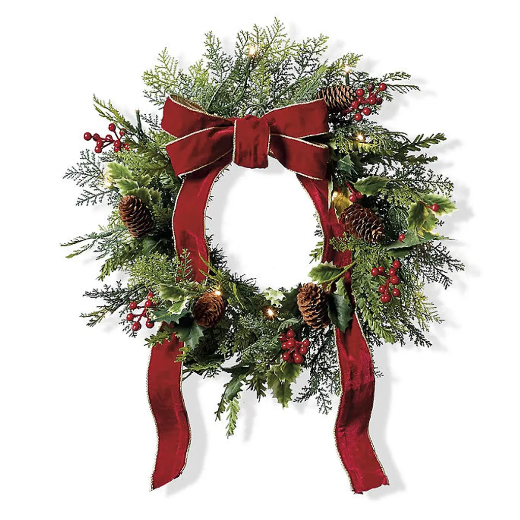 Set the holiday scene in an instant with a mixture of greenery that's amazingly full and realistic. Our Christmas Cheer Patio Wreaths overflow with sprays of Scotch and pistol pine, noble fir, pine cones, variegated holly and ruby red berries. Suitable for indoor or outdoor use To maximize the life of your greenery, we recommend a limit of 3 months of outdoor exposure per year Each wreath lit by 15 warm white LEDs Accented with a red velvet bow with gold lining Each wreath requires two "AA" batteries (not included) Cordless with on/off timer functions on battery box To activate, press the timer button at the time you wish lights to come on; lights will have six hours on and 18 hours off and repeat the cycle until battery life ends Fluff and shape greenery after unpacking Wipe clean with a soft, dry cloth Set of two Imported A Frontgate exclusive. At Frontgate, our primary focus is quality. We guarantee that every product we sell will stand up to the supreme test – our customers' satisfaction. To learn more about our policies, visit our Shipping & Processing, Returns & Exchanges and Warranty & Price Guarantee pages.
