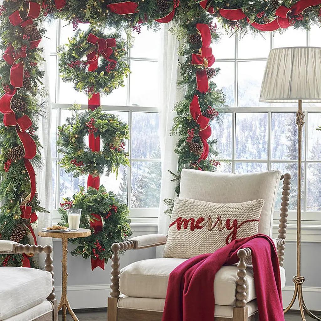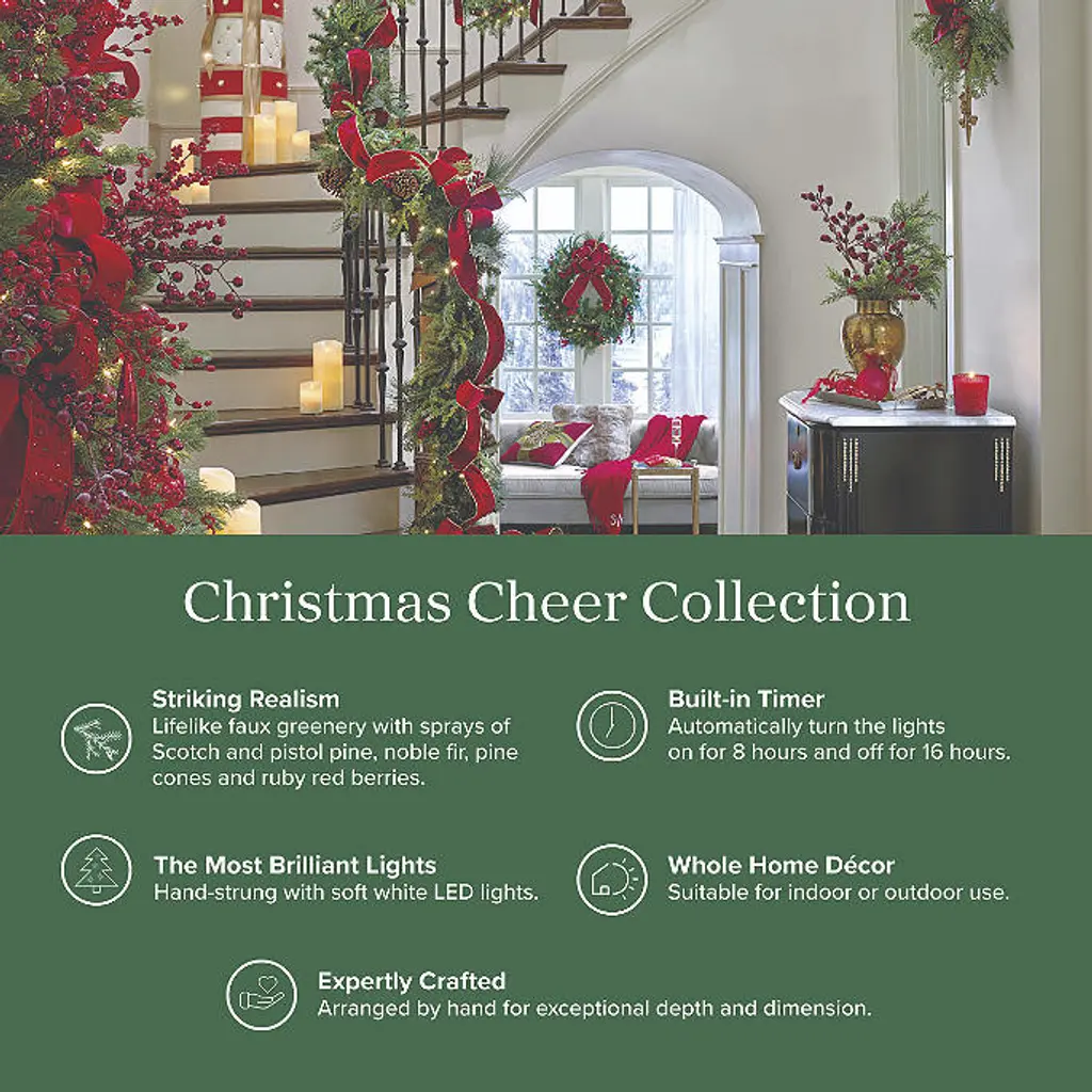 Create a captivating new look with this trio of 20" wreaths, all fastened to a large red ribbon that's capped with a bow. Each lifelike wreath overflows with sprays of Scotch and pistol pine, noble fir, pine cones and ruby red berries, pre-lit with long-burning lights. Suitable for indoor or outdoor use To maximize the life of your greenery, we recommend a limit of 3 months of outdoor exposure per year Each wreath features 30 warm white LEDs Has a looped ribbon at the top for hanging Cordless with on/off timer functions on battery box To activate, press the timer button at the time you wish lights to come on; lights will have 8 hours on and 16 hours off and repeat the cycle until battery life ends Each wreath requires three "AA" batteries (not included) Fluff/shape greenery after unpacking Imported A Frontgate exclusive. At Frontgate, our primary focus is quality. We guarantee that every product we sell will stand up to the supreme test – our customers' satisfaction. To learn more about our policies, visit our Shipping & Processing, Returns & Exchanges and Warranty & Price Guarantee pages.