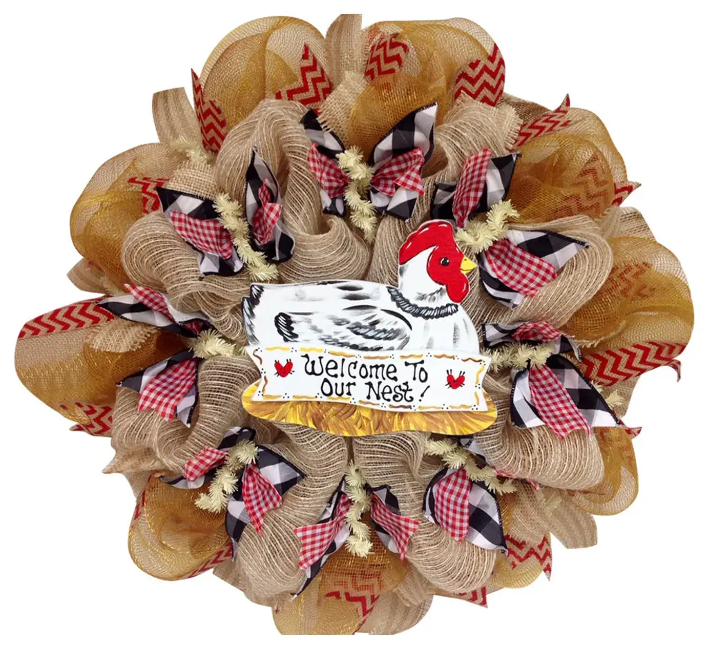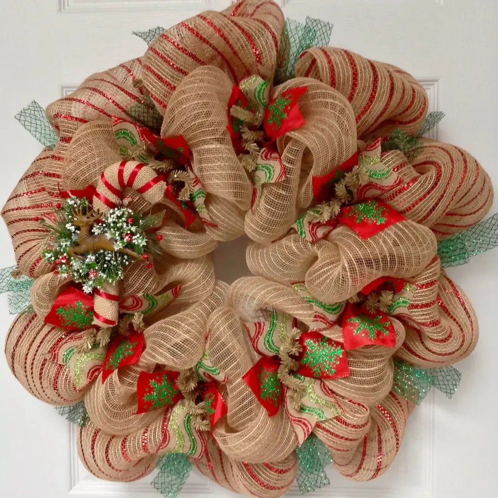 New! Large, Premium, Full Handmade Deco Mesh Christmas wreath. Four adorable Gingerbread cookie ornaments are placed on soft creamy Deco mesh burlap. Beautiful premium green and red plaid woven ribbons and burlap ribbons with red and green velvet zig zag trimming are placed around the center ring. The outer ring is made of burlap Deco mesh with green and red metallic stripes. Green frayed burlap ribbons and green and red metallic chevron canvas ribbons surround the exterior. Perfect addition to your front, side or back door, kitchen, or any room in your cozy home. Size is large, 24 inch diameter and 6 inch depth.