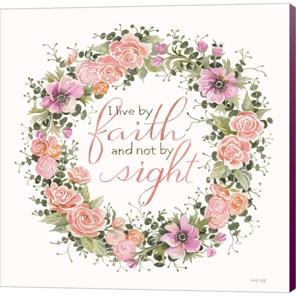 Live by Faith Floral Wreath by Cindy Jacobs is a high quality piece of canvas artwork. The finished size of this piece is 12" X 12", and it has a depth 1.5" with claretwine painted sides. There is a UV protective coating over the entire image, and it is ready to hang on your wall with no hardware required. 100% Satisfaction Guaranteed.