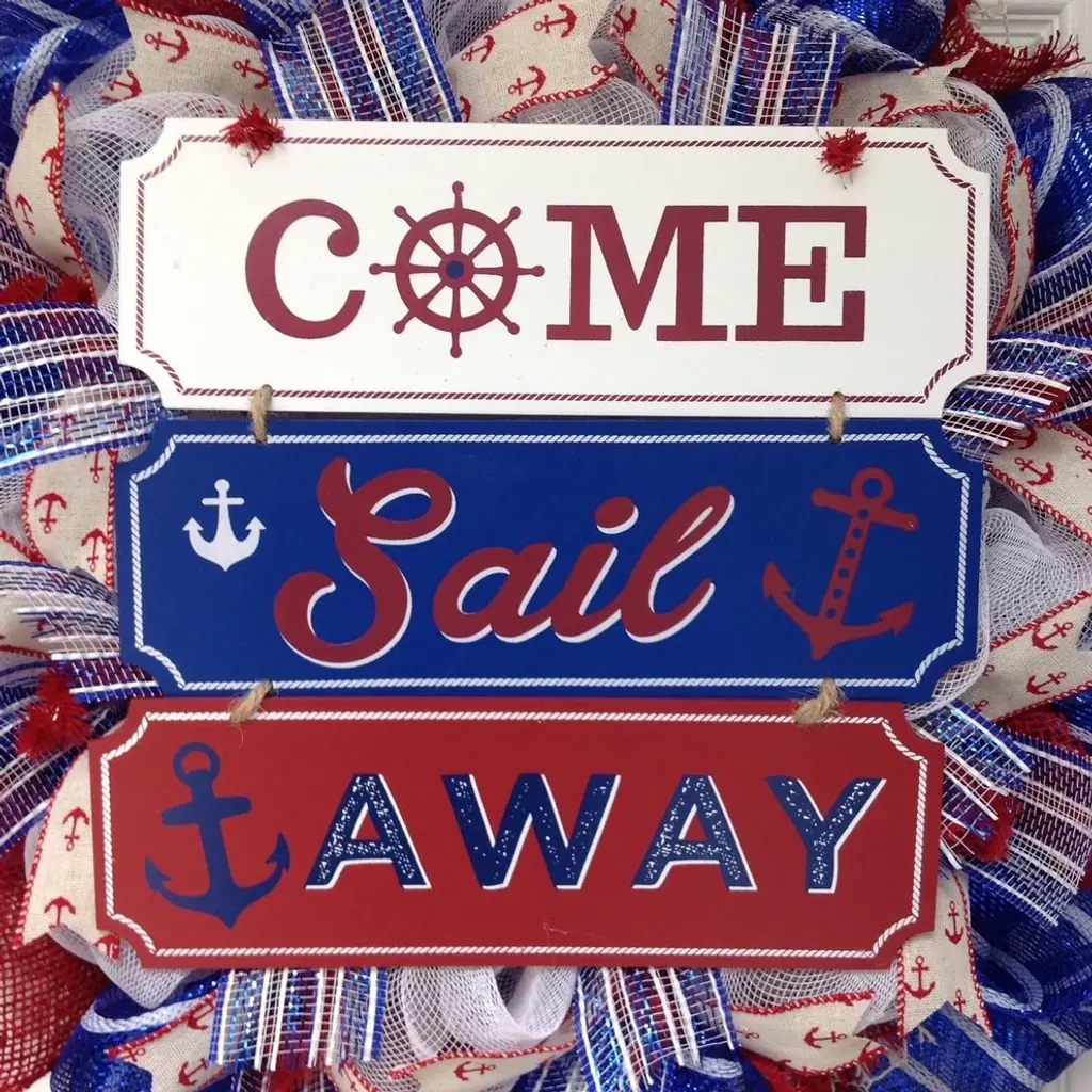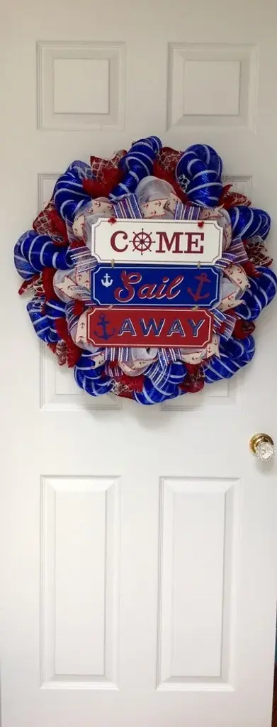 New, Full, Premium, large, handmade deco mesh nautical wreath. Three signs, with the wording "Come Sail Away" written boldly, rests on a bed of pure white deco mesh. The signs are white, red and blue and are decorated with anchors and a captains wheel. The center ring has Royal blue and white striped mesh ribbons and cream canvas ribbons with little red anchors. The outer ring is made of beautiful royal blue and white striped deco mesh. Red burlap and fish net ribbons are placed around the outer ring. The wreath measures 24 inches in diameter and 6 inches deep. Perfect for lake, beach and summer homes.