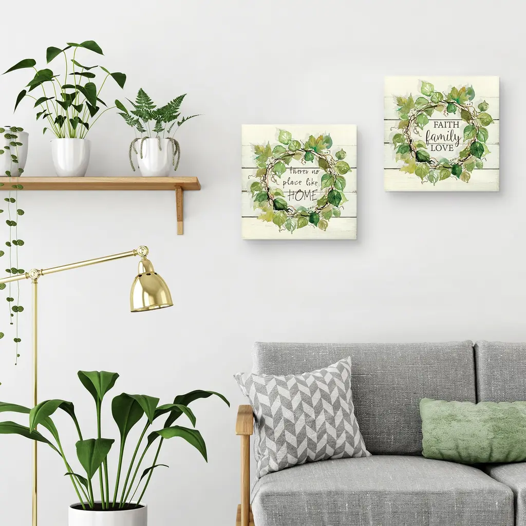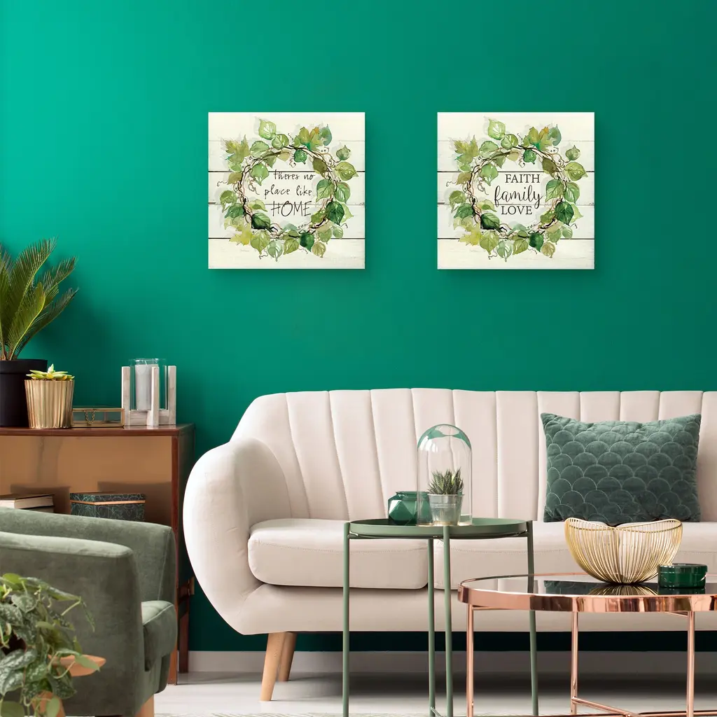 Dainty leaves and twisting vines emerge as a beautiful wreath at the center of two devotional canvas prints. Shades of light green and brilliant emerald pop against a beige-colored shiplap textured canvas, highlighting the saying "there's no place like home" and "faith, family, love". Perfect for hallways, family rooms, or guest rooms alike, this charming set of canvas art prints is a welcome reminder to appreciate what you have. Produced with full-bleed printing that covers the entirety of the canvas, your new masterpieces are made with state-of-the-art technology that provides museum-quality prints. Our print process ensures each piece is produced to showcase the finest details, letting the artwork truly shine. Plus, our expert craftsmanship guarantees a clean and professional look without the need for framing.