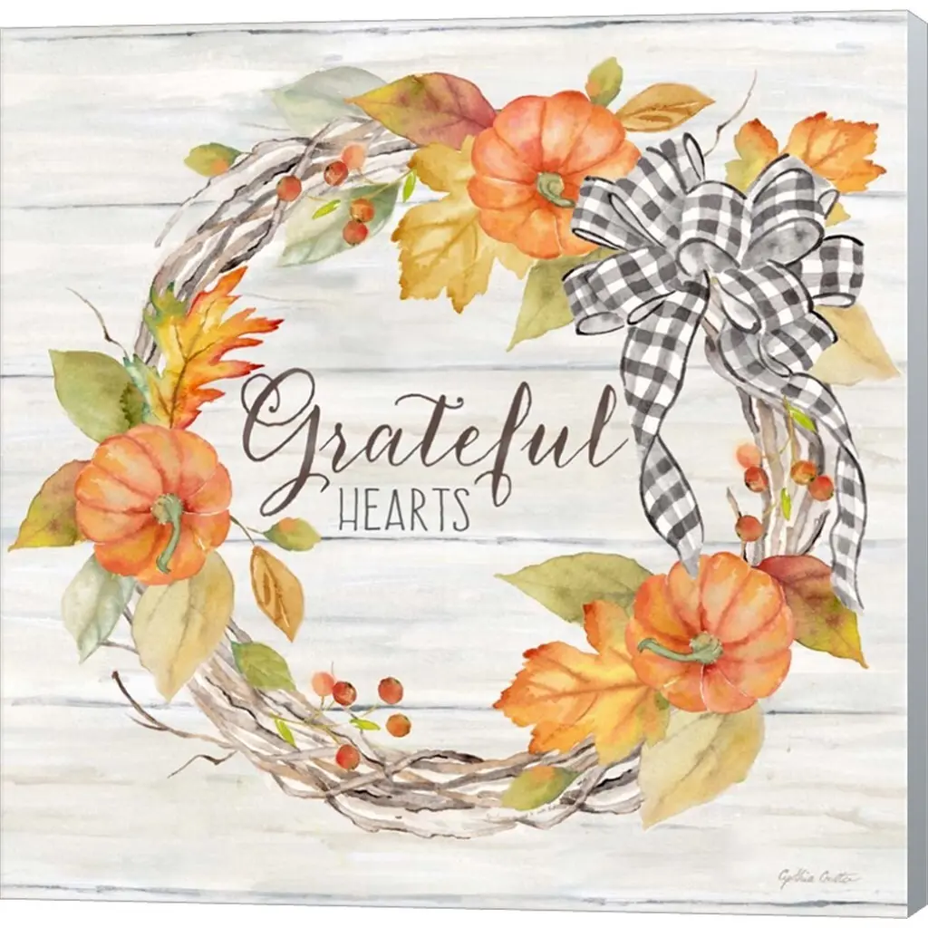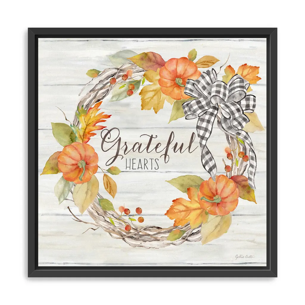 Pumpkin Patch Wreath II-Grateful by Cynthia Coulter is a high quality piece of canvas artwork. The finished size of this piece is 12" X 12", and it has a depth 1.5" with gray painted sides. There is a UV protective coating over the entire image, and it is ready to hang on your wall with a Standard Drywall Screw (not included. 100% Satisfaction Guaranteed.