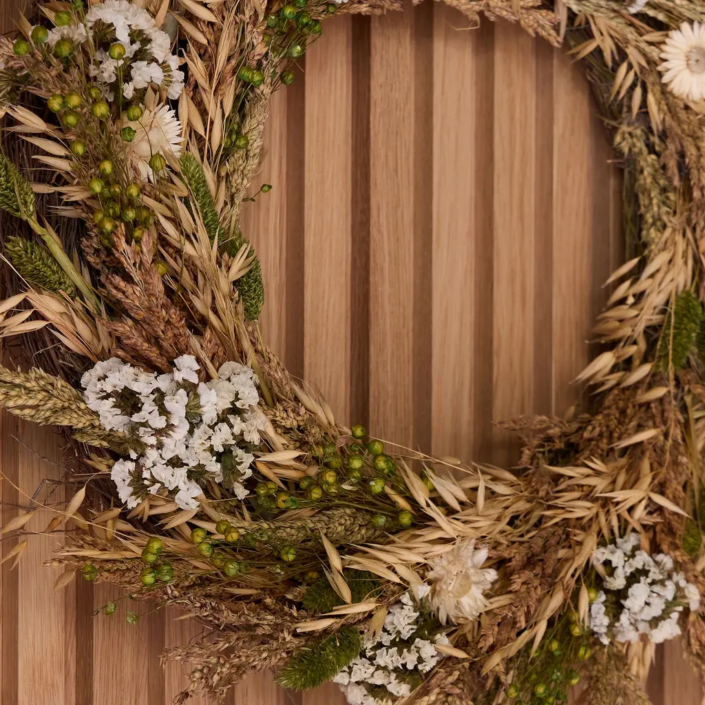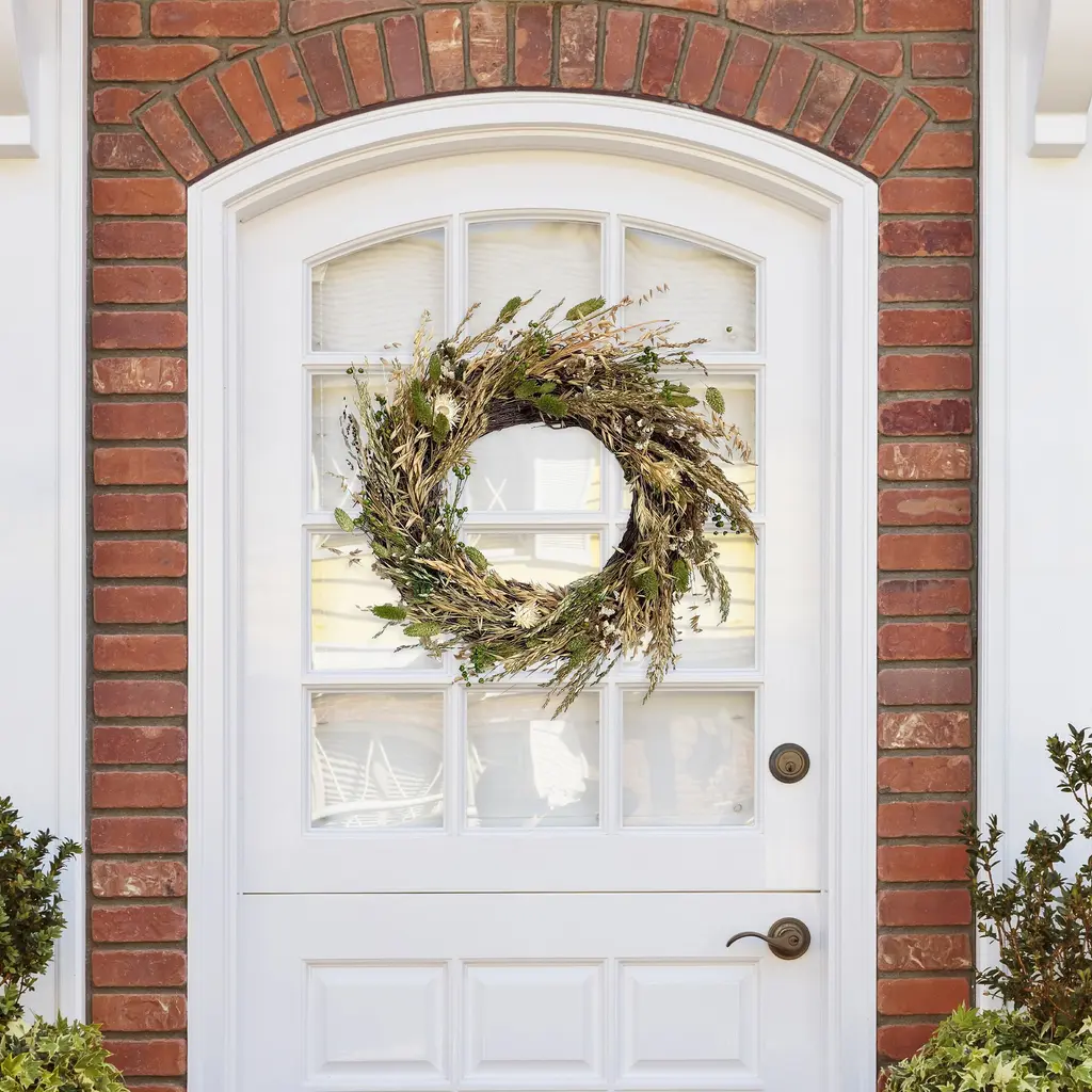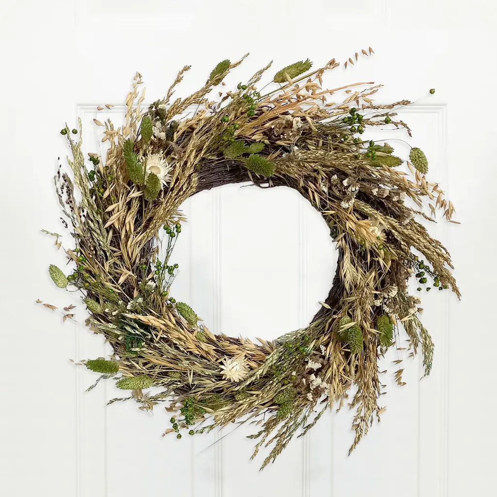 Fully dried to look good year after year. This wreath was handmade using natural botanicals, making each one unique. Add a pop of color to doors, windows or mantels. Makes a great housewarming gift.