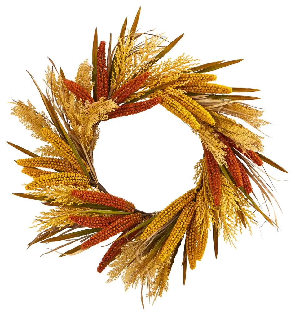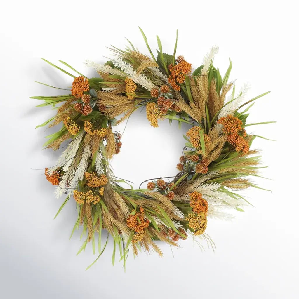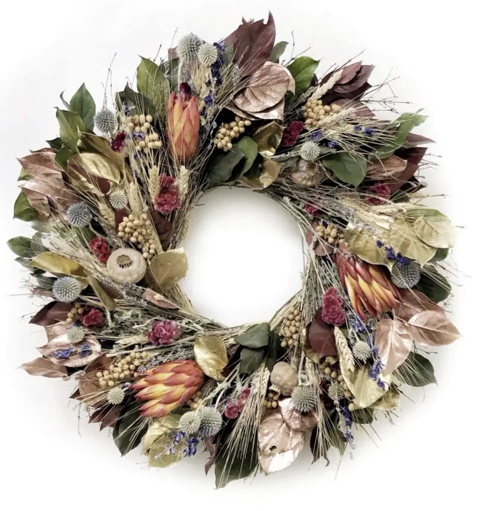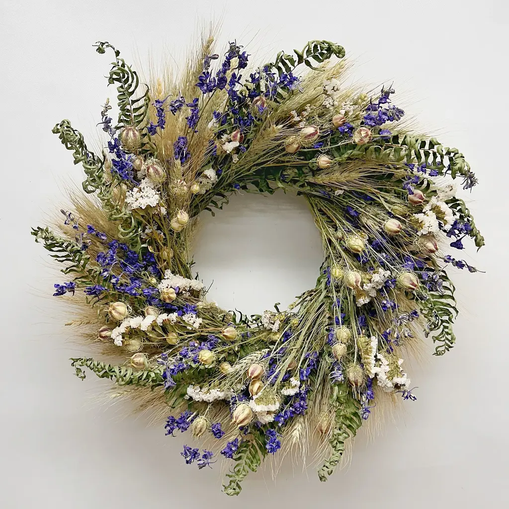 100% USA-grown, this wreath is handmade using naturally dried flowers. Handcrafted using Avena, green wheat, broom corn, artemisia, safflower, millet, tansy, boxwood, and flax, these richly colored flowers form a beautiful fall blend. This wreath is best used for indoor wall or door decor. This can be hung outdoors in a protected location away from direct sunlight, wind, and rain but will last longer inside away from the elements. Dried plants are a natural product; over time these once-living materials continue to lose moisture changes in texture and color are normal and expected.