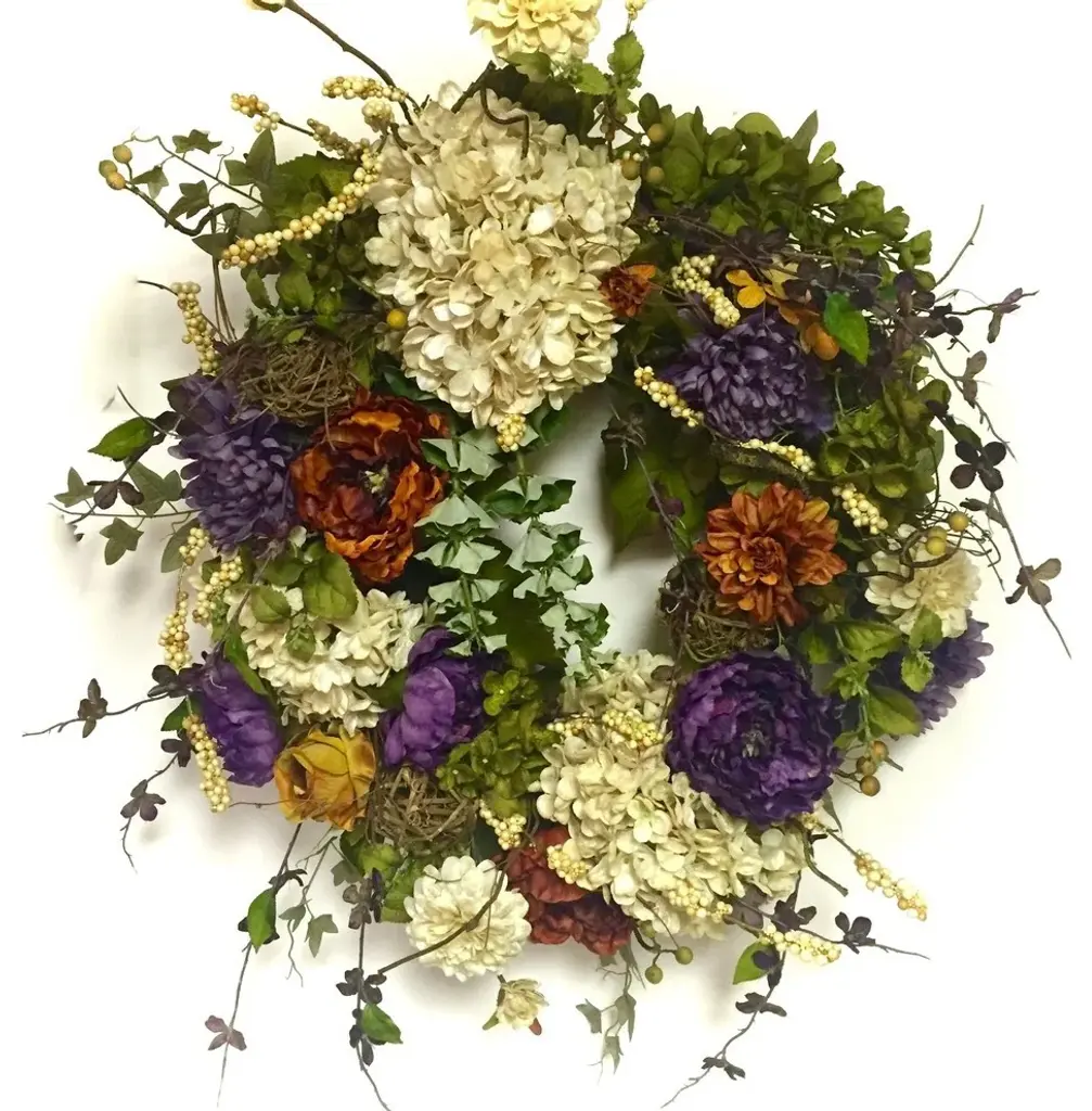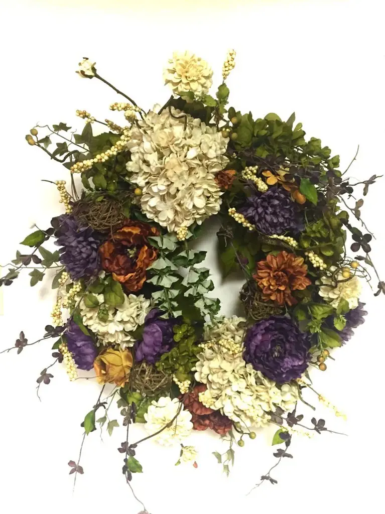 - Fall or All Season indoor and outdoor Wreath! Gorgeous & very full custom designed Life-Like Giant Hydrangeas, Peonies, Zinnia, Rose and Wild Flower Silk Floral Garden Variety of Ivory, Purple, Rust Sage Green and Gold Flowers XL beautiful! 24" x 28" x 7".Deep tip to tip- Spring to Fall Elegance! If you love beautiful rich colors and realistic silk flowers, these are some of the most beautiful and realistic that I''ve found. This large, beautiful combination of, gold roses, giant ivory hydrangeas, and large purple zinnia and Plum-Purple Peonies... among many other accent flowers are gorgeous!! - This garden of flowers is on a 18-24" twig vine wreath base. The finished size is approximately 24" x 28" x 7" - A elegant and colorful addition to your home for many seasons and many years of enjoyment! This large beautiful wreath can take you from summer right up into the Holidays!- Perfect for you front door to welcome your guests or formal enough for your living or dining room as part of your year-round decor. This piece will be a " colorful, beautiful" accent... adding warmth to your home or office. - As with all my pieces, I make sure every detail is carefully thought out to make this hand crafted wreath one of a kind. These gorgeous colors make this piece truly one of my favorites!- This beautiful wreath can be used from spring right into fall...through the holidays, or in your favorite room all year long! It can be used over a fireplace, foyer, office, door, hallway etc. It would also be a beautiful addition to your front door (under cover of course) (This piece measures approximately 24" x 28" x 7" deep)