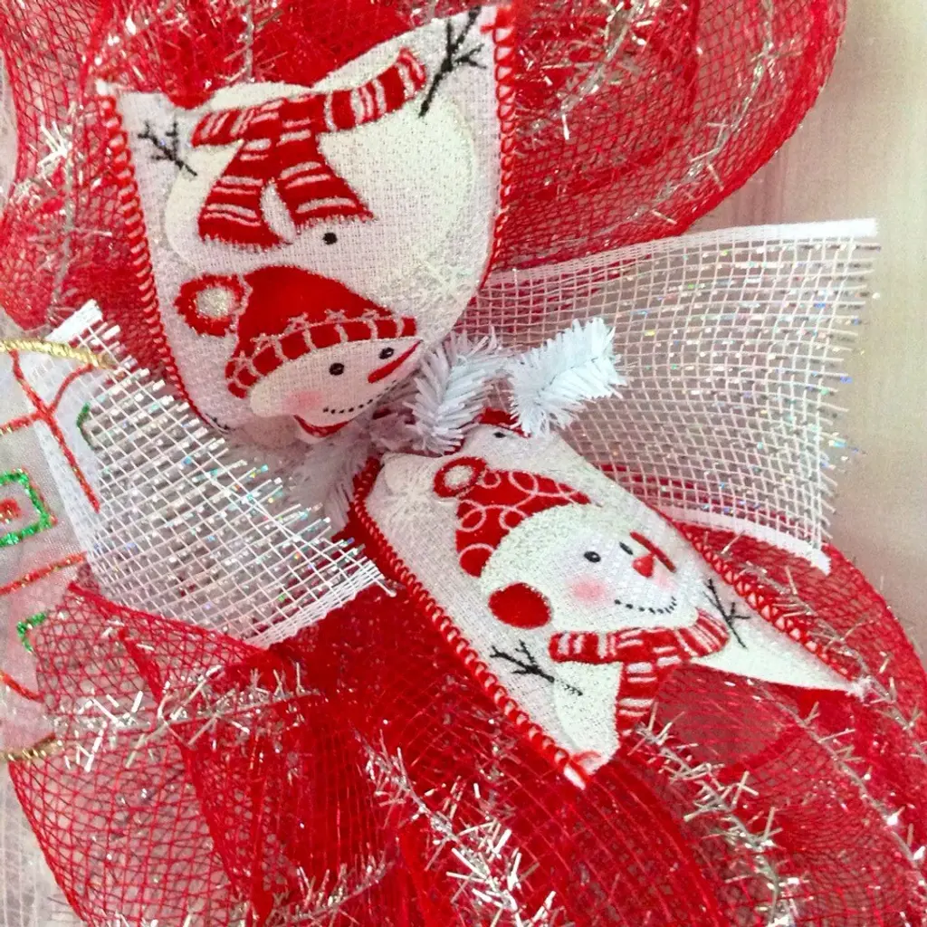 New! Large, Premium, Full Handmade holiday Wreath. The outer ring is made of beautiful, bright red deco mesh with silver tinsel lines. The tinsel has a fuzzy texture. White iridescent mesh ribbons surround the exterior along with adorable, snowman ribbons. The inner ring is made of iridescent snowball white deco mesh with sheer white ribbons decorated with green and red diamonds. Large, glittering Elf Stocking rests in the center of the wreath. Stocking is decorated in red and white Candy cane stripes and green glitter. It is stuffed with a Christmas tree and gift with large gold bow. Size is a large 24 inch diameter and 6 inch depth. Please see photo for size comparison.