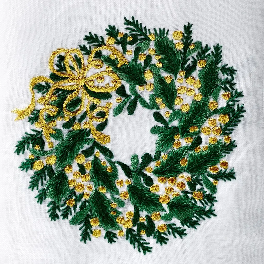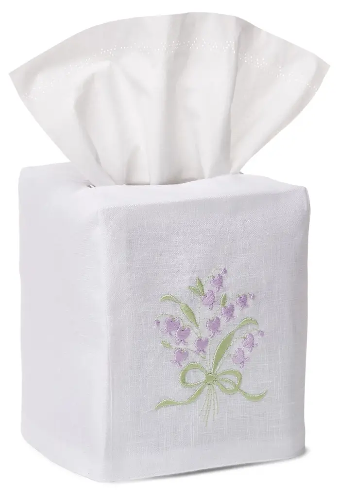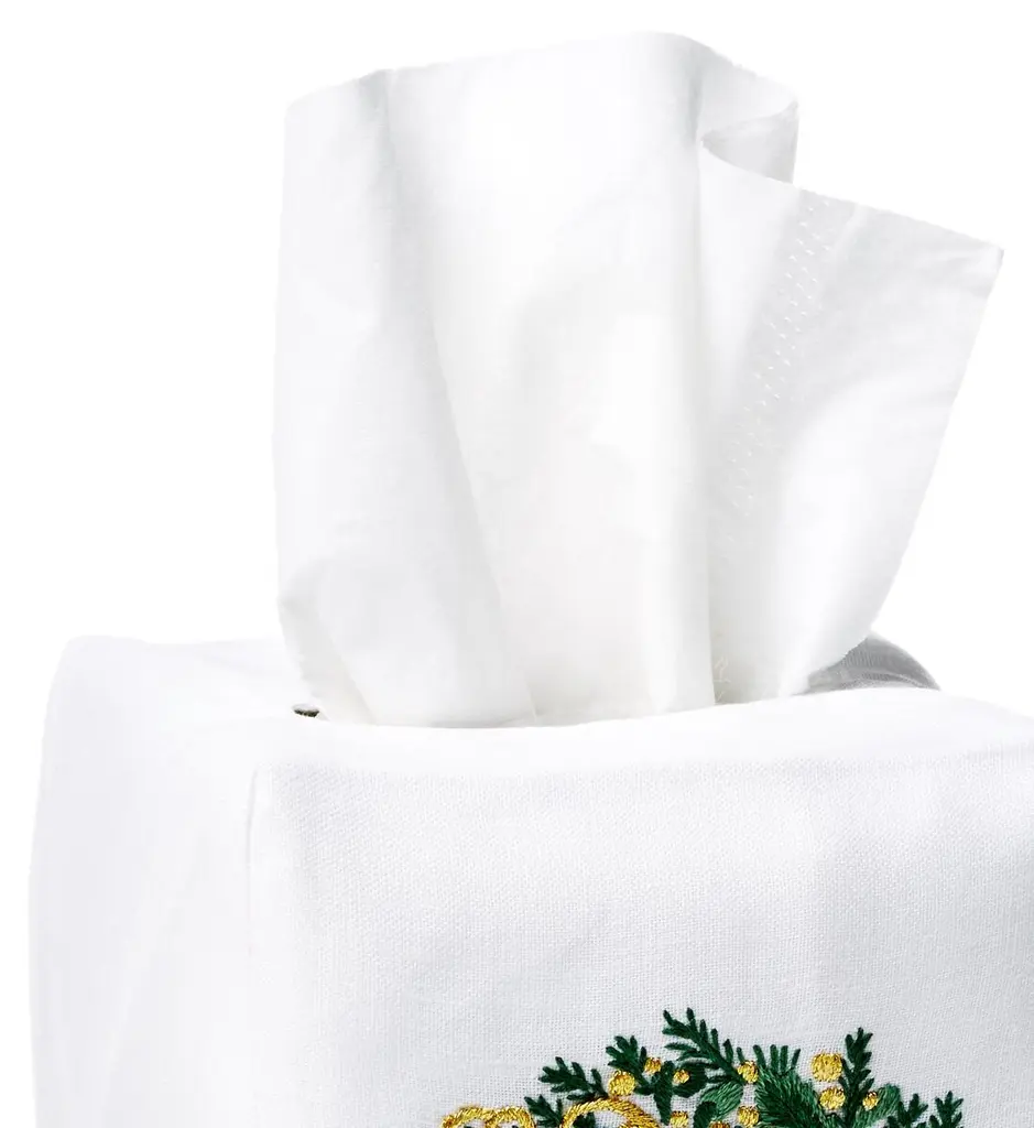 Offered exclusively through One Kings Lane, this exquisite tissue box is made from crisp white linen and hand-embroidered with a festive wreath motif.