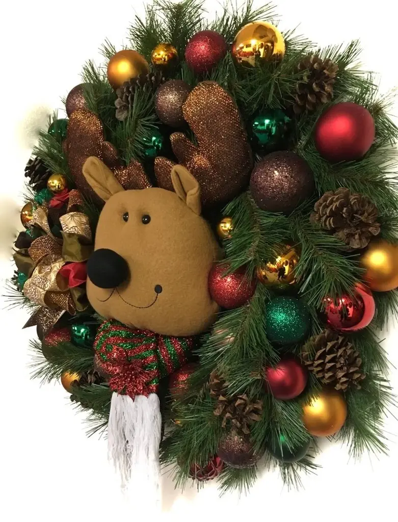 - Welcome your guests with this large 30'''' whimsical, adorable reindeer shatterproof ornament, pinecone wreath! Red, brown, gold & green indoor or outdoor use (under some cover from the elements).- If you are looking for a "WOW" factor, this is it!! It''s a must see! Great for a vaulted ceiling, fireplace or door!- Comes from a smoke free shop! - This large long needle, pine wreath is approximately 30" Tip to tip finished on a 30" long needle pine base. It features a very large & adorable plush winter reindeer! - I custom designed this elaborately hand crafted bow with 4 different types designer wired ribbon. Each ripple of the ribbon is glued in place and the bow is wired in to give you many years of enjoyment! - To complement the piece, I have carefully hand glued durable SHATTERPROOF ornaments with satin, glitter finishes throughout and also included natural genuine pinecones. - I carefully hand wired and glued this adorable reindeer into the center of the wreath. - As with all my pieces, every detail is carefully thought out to make this hand crafted wreath one of a kind. Everything is securely attached (wired and/or glued) and will arrive in just as beautiful condition as you see in the picture! The striking colors, unique mixture of ornaments and the stunning hand crafted elaborate bow make this wreath a stand out piece! The picture simply does not do this wreath justice! - Comes shipped in a sturdy reusable box for storage!- Please Note: I do fill all my bows with tissue paper for shipping to prevent them from losing their shape during shipping- All my wreaths & arrangements are 100% Custom designed handmade by myself, described in full detail with many photos, packed VERY securely for shipping, well taken care of and stored very carefully until sold!