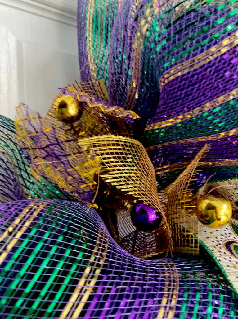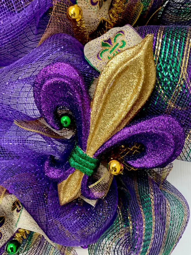 Gorgeous! Full, Premium Mardi Gras Handmade Deco Mesh Wreath. A beautiful, Mardi Gras mask , decorated in gold, green and purple rests on a bed of shimmering metallic purple deco mesh. Mask has beautiful feathers, streamers and ribbon trimmings! A large, glittering Fleur de Lis is placed on the opposite side of the wreath. The inner ring has mesh ribbons in gold and premium Mardi Gras ribbons. The outer ring is a metallic green, purple, gold deco mesh. Bright iridescent gold mesh bows and gold, purple flex ribbons add fullness to the outer ring. It is a extra large 28 inch diameter and 6 inches deep. Perfect for fireplaces, large windows and walls.
