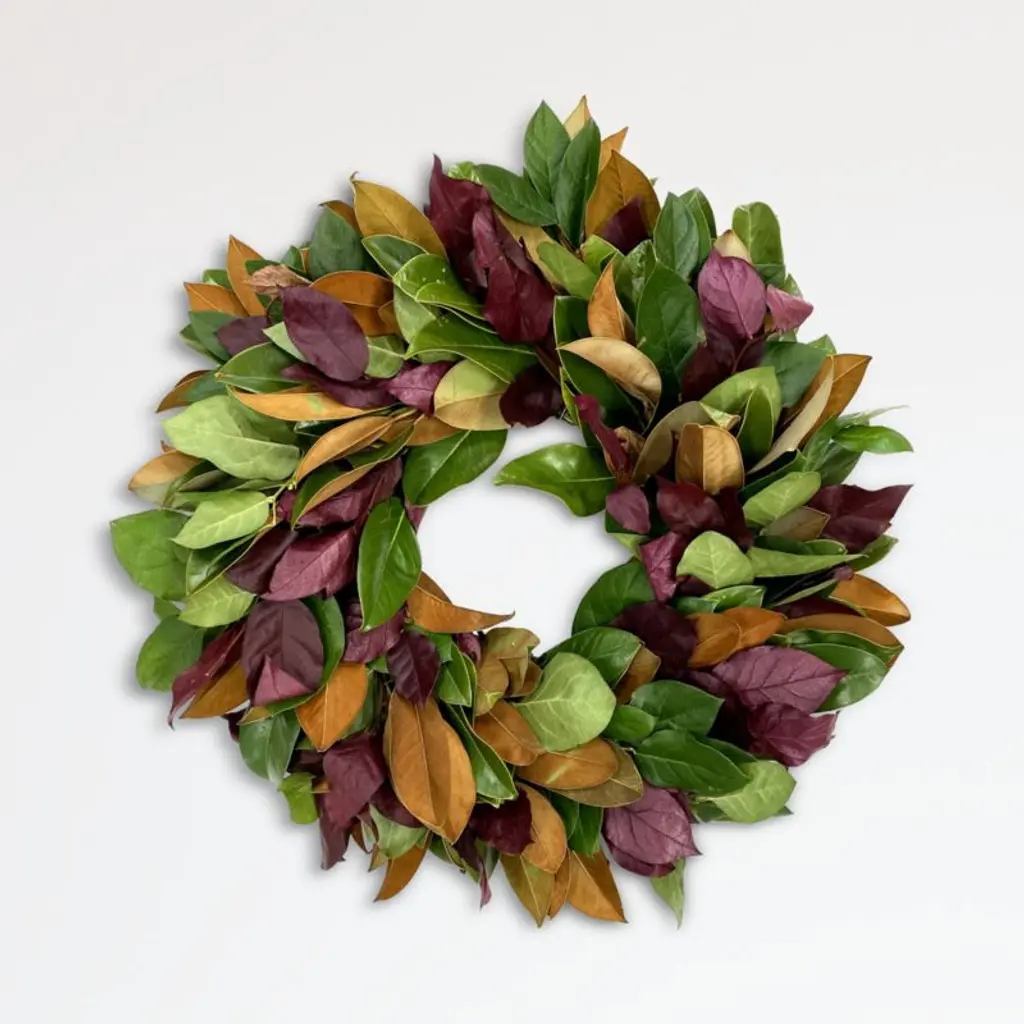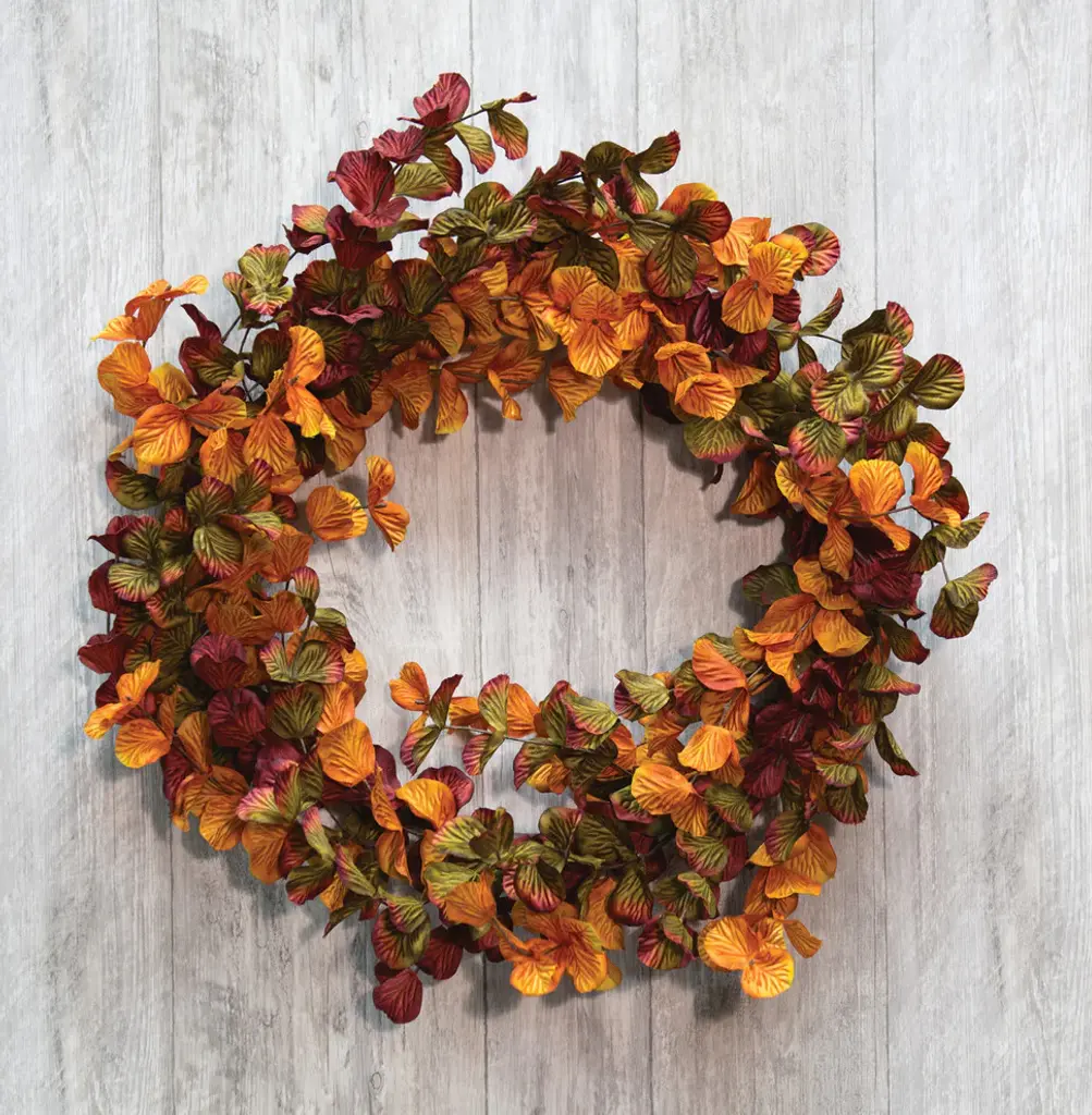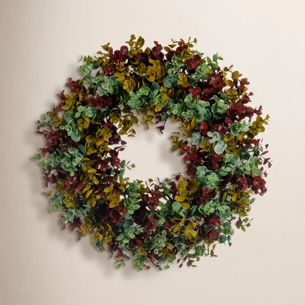 Fall Eucalyptus Wreath features fabric leaves in a range of orange, red, and green colors that invoke the cozy feeling of fall. Wreath measures 12" inside and 22" outside diameter.
