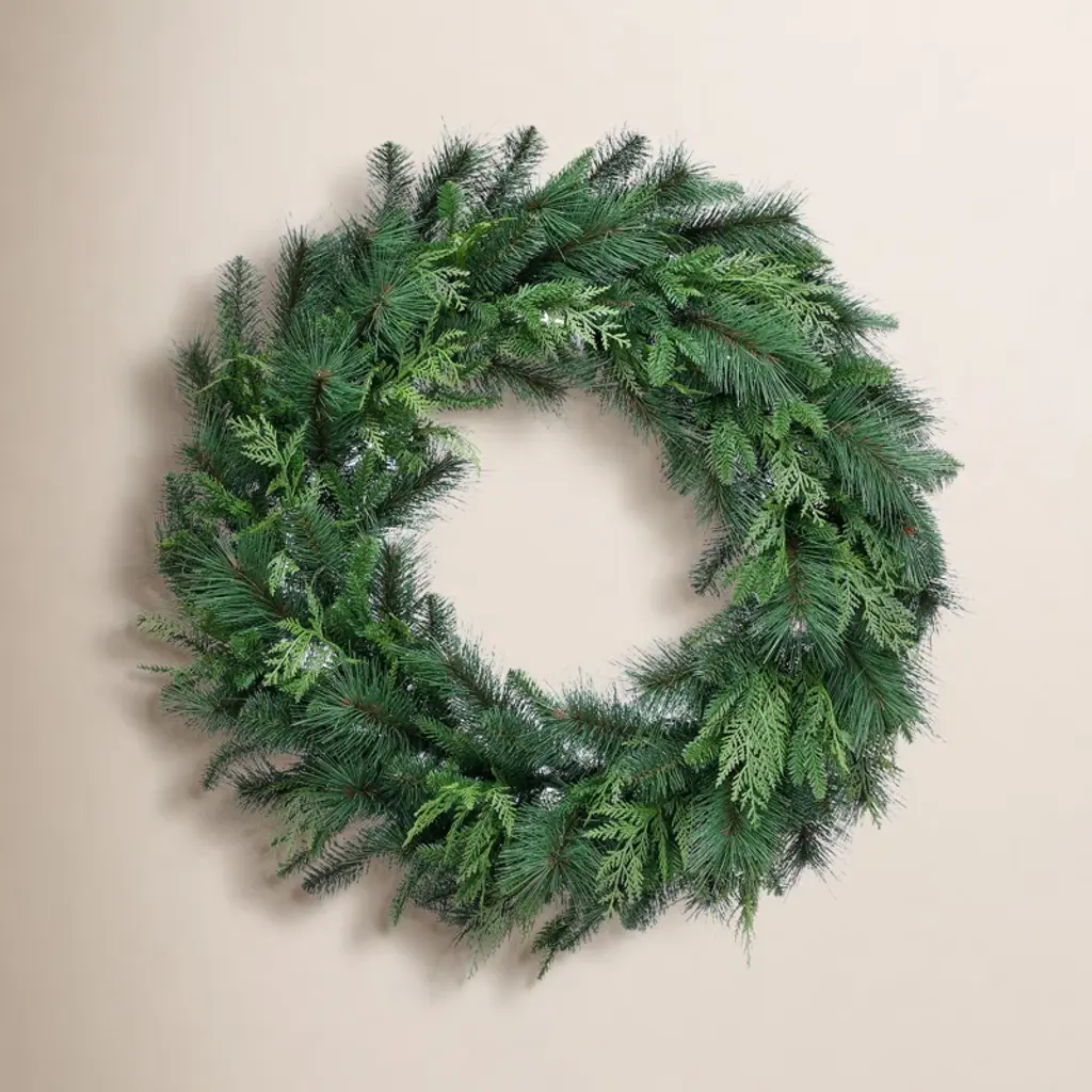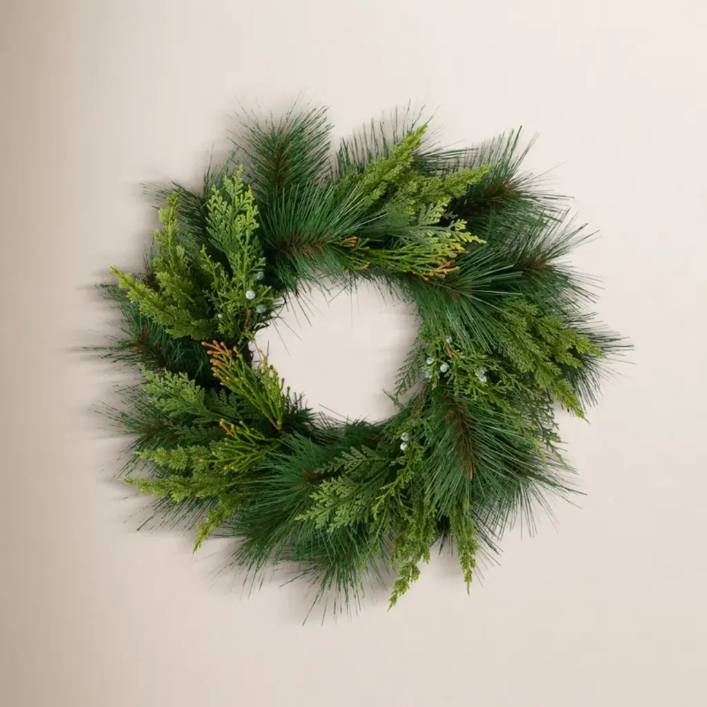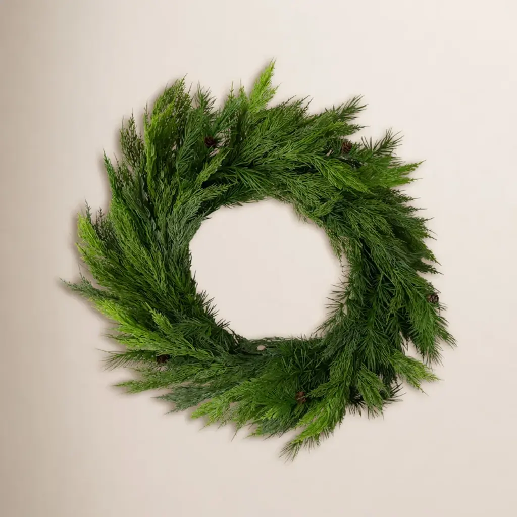 Crafted to resemble cedar boughs accented with natural twigs, our Faux Cedar Wreath adds an organic element to your holiday décor, filling your space with festive ambiance.