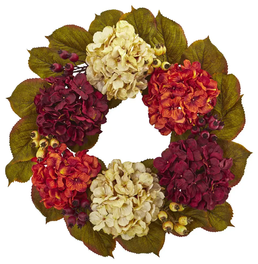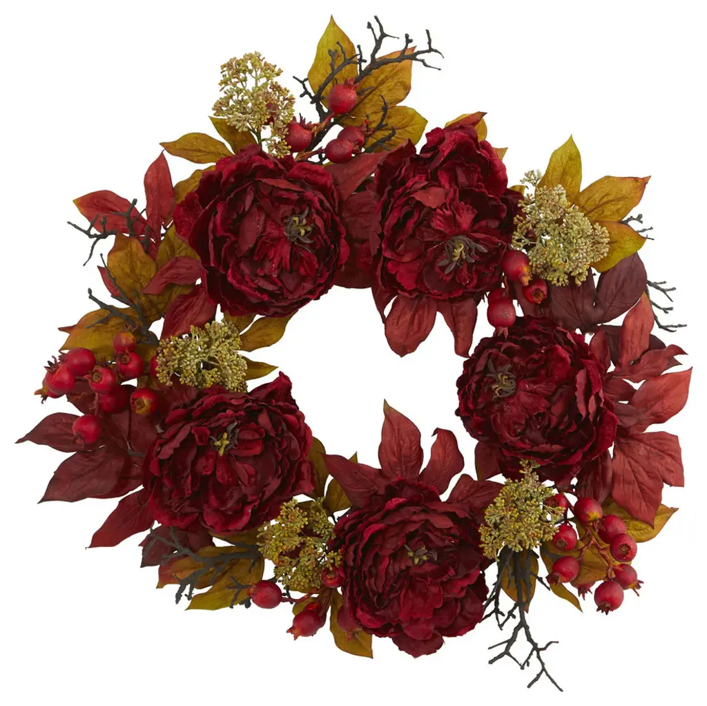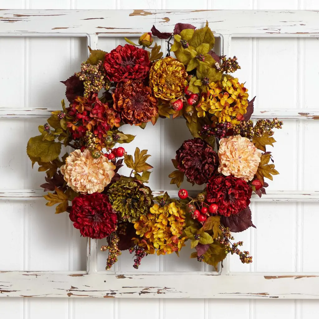Faux hydrangeas and peonies, crafted to look as if they were lovingly dried, are dotted with equally lifelike berries and foliage to create this autumnal wreath.