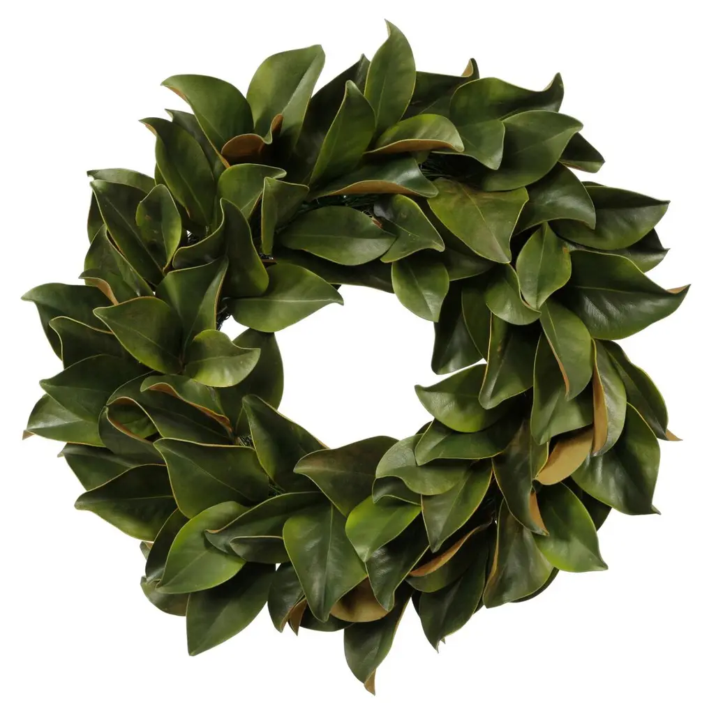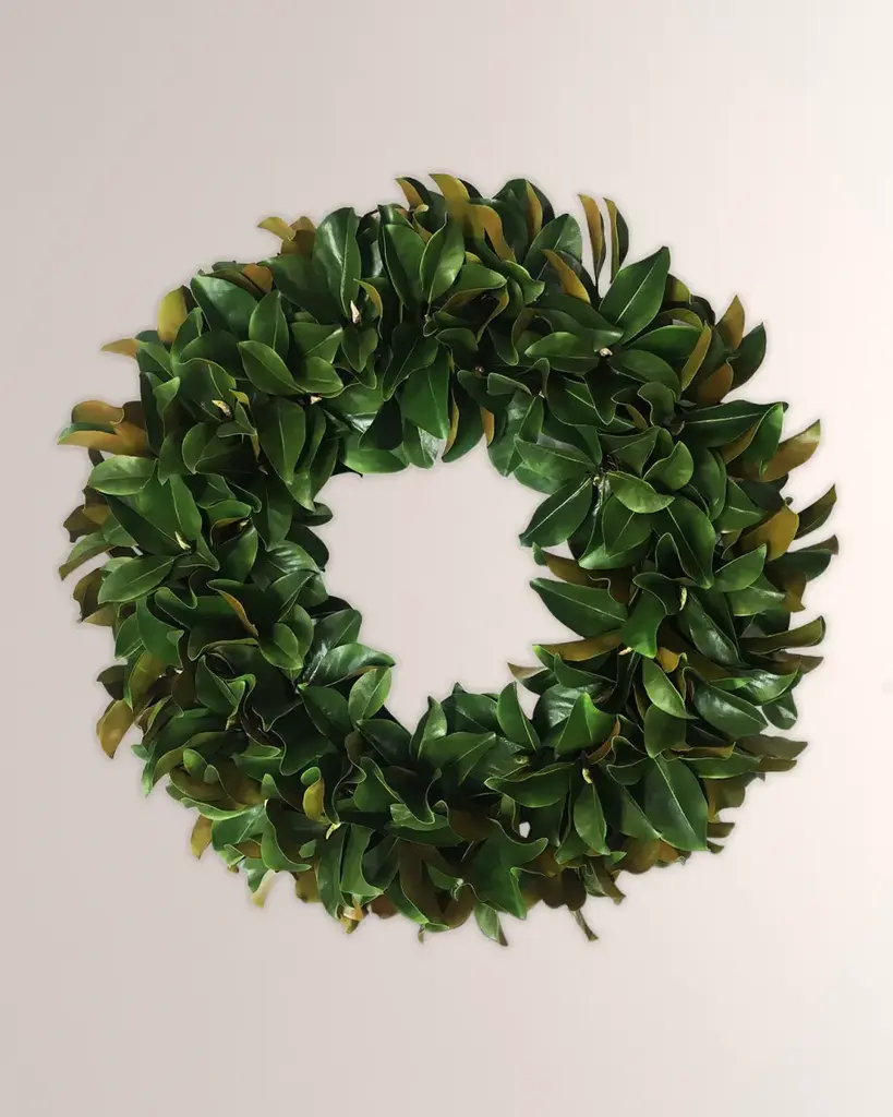 The Magnolia Leaf Wreath is a simple and realistic wreath of magnificent magnolia foliage. If you are looking for a touch of green to go with your decor, yet you want to maintain a touch of formality and sobriety, this wreath may be just the thing you are looking for. Quiet and unassuming, this wreath vastly increases the beauty of the door where you hang it or the place on which you use it as a centerpiece without drawing undue attention to it.