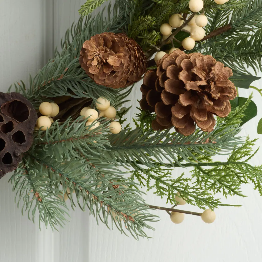 This 24-inch half wreath is handcrafted of natural twigs and decorated with faux greenery, white berries, real pinecones, and a centerpiece lotus-flower pod. Expertly arranged artisan decor, this woodland wreath is a showcase of gorgeous textures in the refreshing colors of the great outdoors. A charming standalone accent, its layers of naturalistic botanicals invite layering with a colorful array of our exclusive seasonal decor.