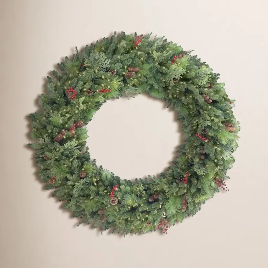 Add sparkle and lifelike greenery to your holiday home with our pre-lit wreath. Skillfully crafted to look just like the real thing, the lush faux greenery showcases evergreen sprigs, glossy leaves, pinecones and frosted red berries. Lit with LED lights, the battery-operated wreath brings nature's beauty to your seasonal decor.