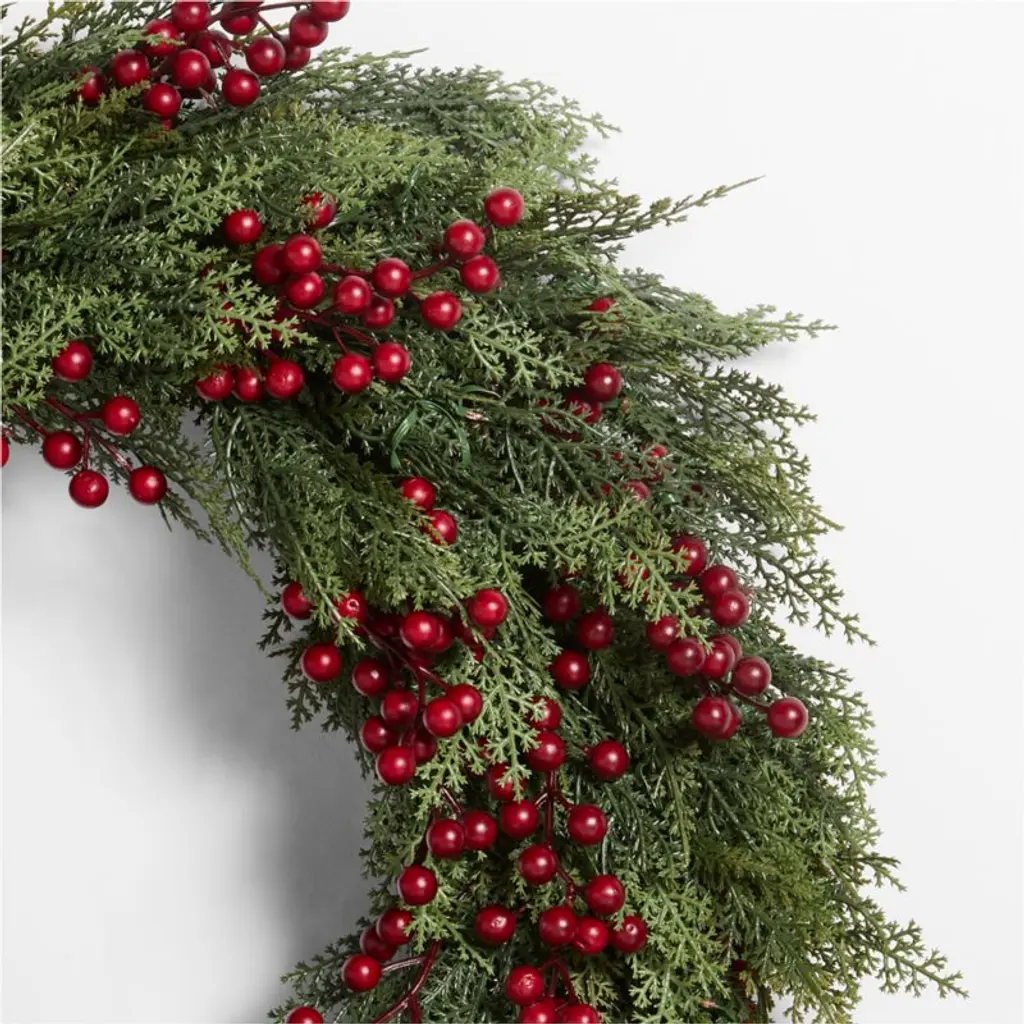 Our pre-lit garland and wreath grace the home with the lifelike greenery. Skillfully crafted to look just like real botanicals, the set replicates the soft, feathery appearance of hemlock boughs accented with clusters of red berries. Lit with warm white LED lights, the battery-operated wreath and garland brings nature's beauty to your seasonal decor.