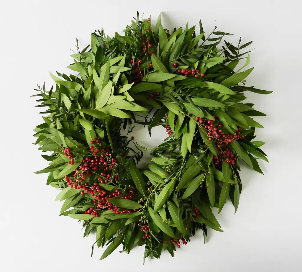 Fill the holiday home with the beauty and fragrance of fresh-cut greenery. This wreath combines boughs of bay laurel and pepperberry branches, each hand-selected for color, shape, and freshness. A truly exceptional display of winter foliage, it makes a beautiful, lasting gift for hosts and loved ones.