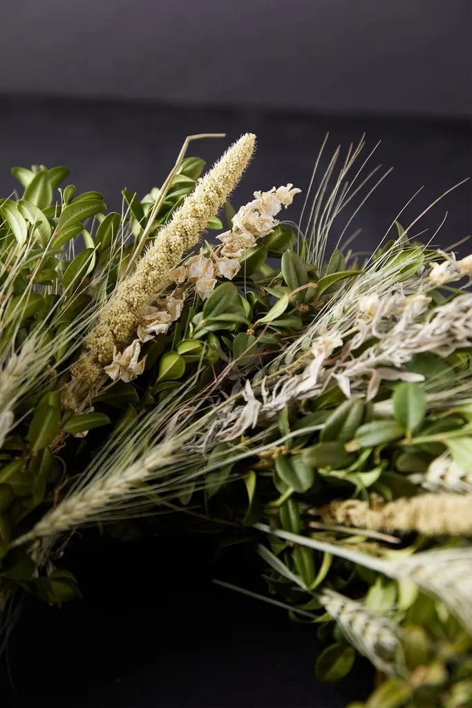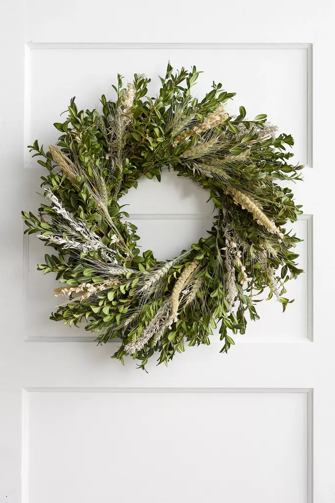 Grown and harvested on an organic, woman-owned farm in the United States, this boxwood wreath is sprinkled with larkspur, artemisia, green club wheat, and millet to make it a bountiful celebration of the season.