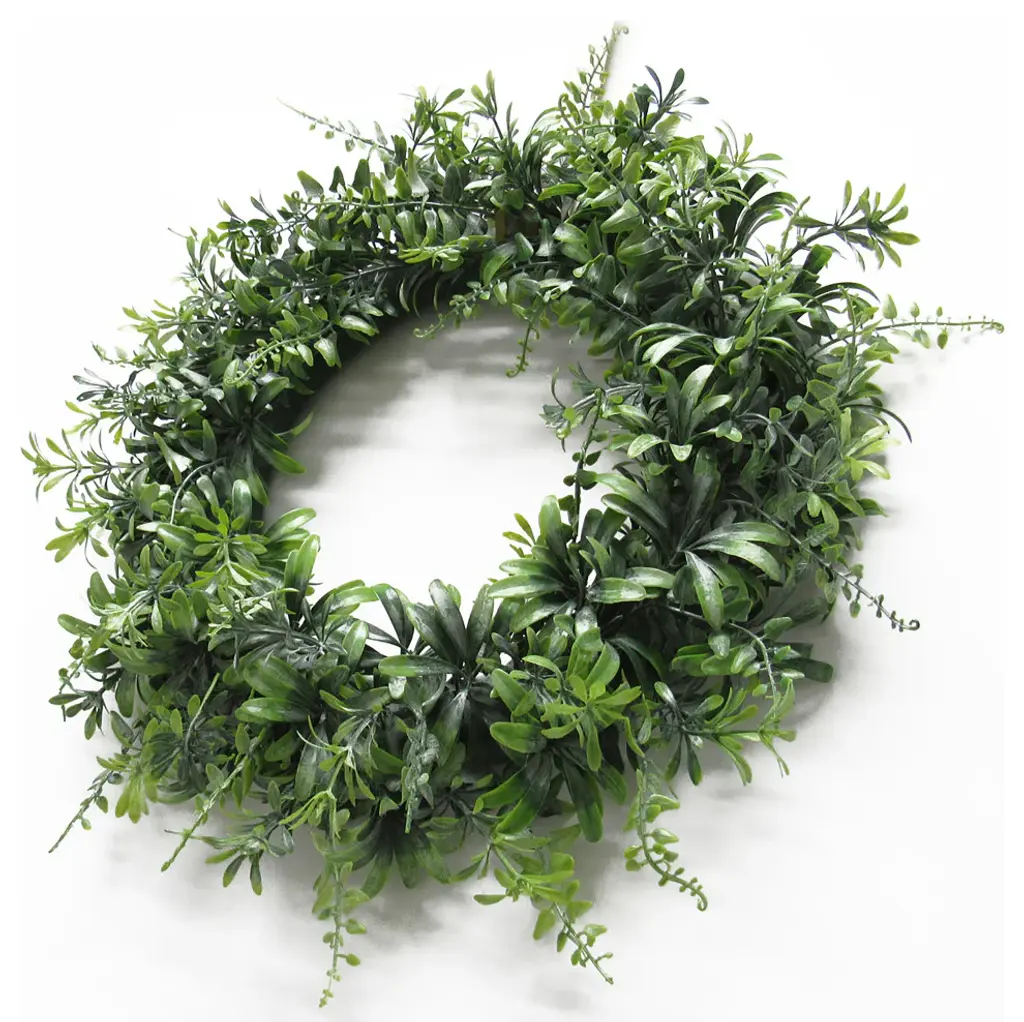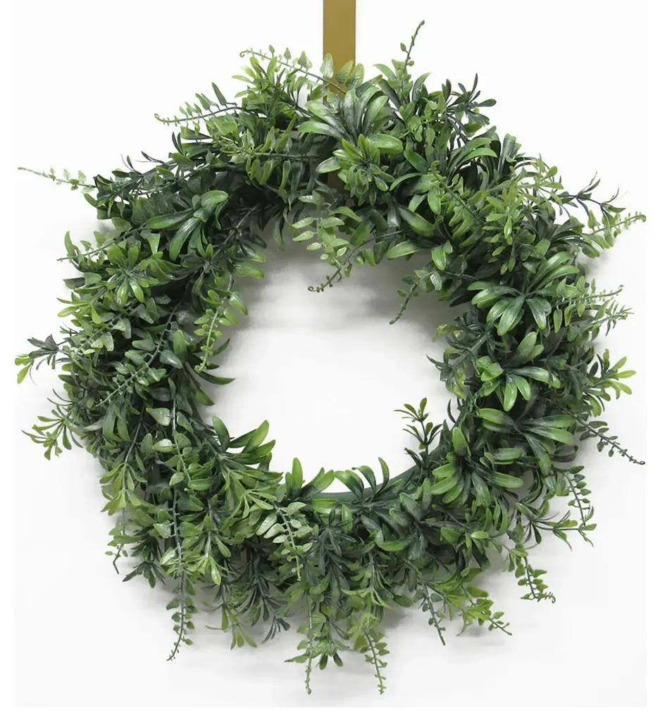 This artificial wreath is popular for its frosted color and gorgeous ring of mixed greenery. Understated yet full, great for versatile use. Easy to incorporate into any home, office, or event setting for a touch of greenery. Display as a hanging wreath, tabletop centerpiece, candle ring, and more! Forever fresh, no hassle.Features:• 14" H x 14" W x 3.75" DP• Frosted fern foliage on sturdy plastic ring backing • Hanging or tabletop use • Best for indoor or covered outdoor usage • Product may ship compressed. Primping of branches or leaves may be required to match the image shown. Images represent actual product, but please understand color may vary slightly due to differences in computer monitor color displays, photographic lighting, or image enhancement.