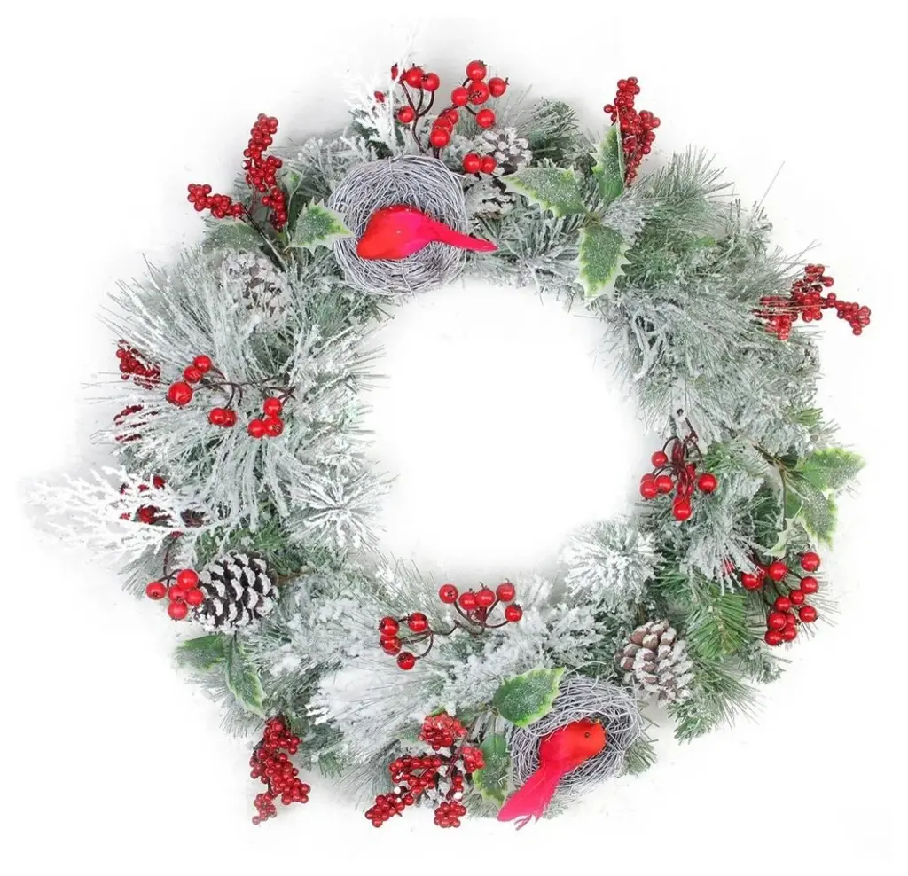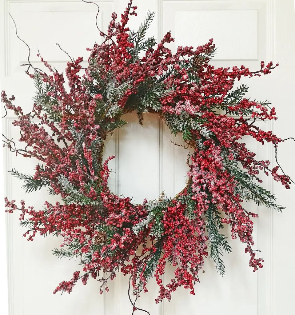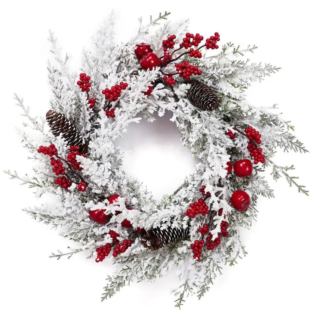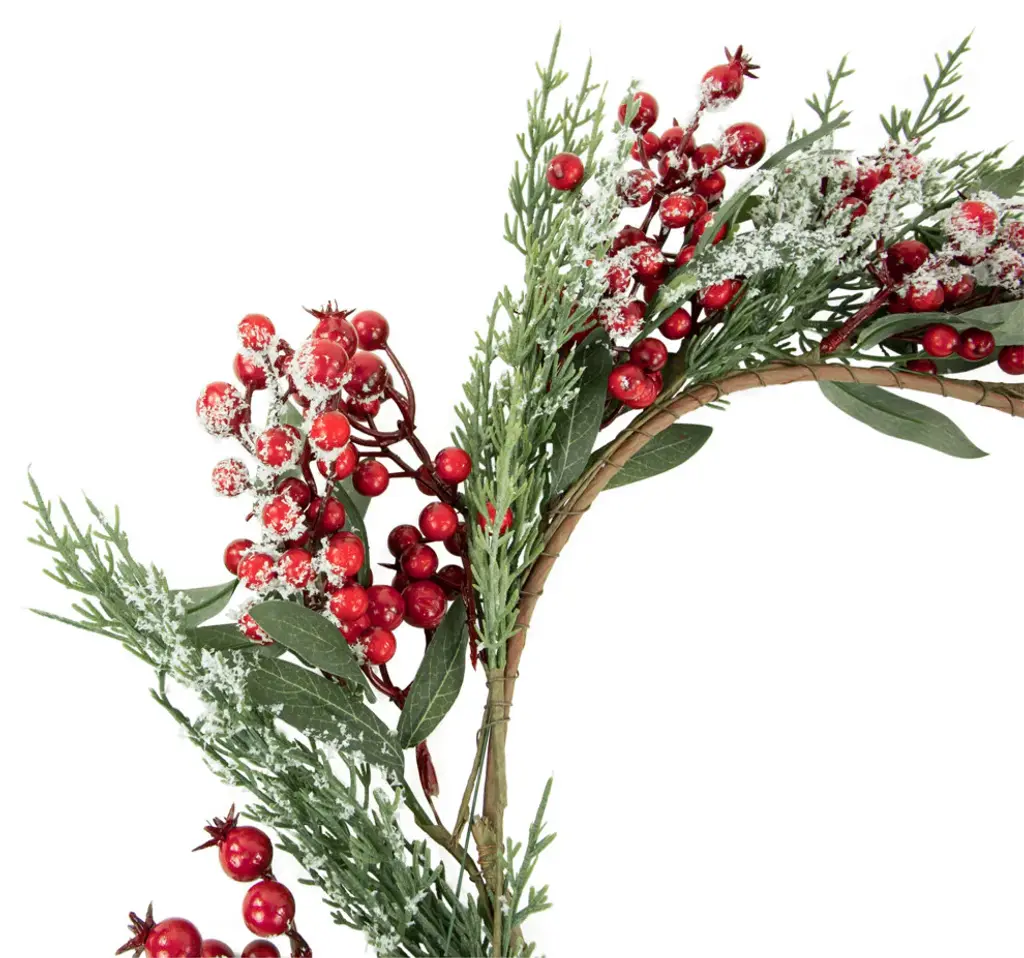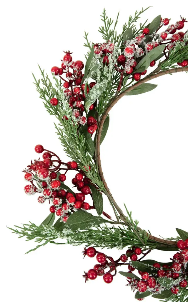 Add a pop of color and a touch of nature to your Christmas decor with this frosted red berry and pine wreath. Designed with frosted glitter it will provide sparkle wherever it is placed. This wreath is perfect for hanging on walls on a door or adding candles and creating a unique table decoration. Product Features: Red berries Christmas wreath Features red berries and green pine leaves Accented with silver glitter and frost Artifical twig frame for hanging No assembly required � wreath comes in 1 piece For indoor use only Dimensions: 18" diameter (measured from outermost edge to outermost edge across the wreath) Inner ring dimensions: 10.75" diameter Material(s): plastic/glitter
